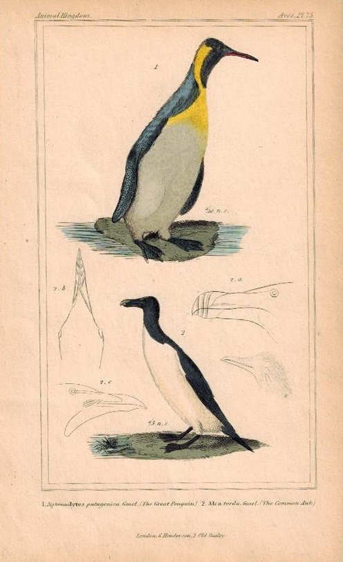Старинная гравюра «Пингвины» знаменитого издания «Царство животных» Жоржа Кювье. Раскрашенная вручную. 1837 год. Размер листа: 22х13 см.