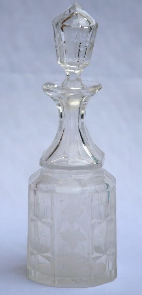 Тулово коническое, с ограненными плечиками, переходящими в грушевидное 6-гранное горло с горизонтально отогнутым краем. Тулово огранено прямоугольниками с орнаментом из гравированной виноградной лозы и горизонтальных алмазных прорезок. Основание круглое, с алмазной «звездой» в центре. Пробка выдувная, коническая, с аналогичным декором.
