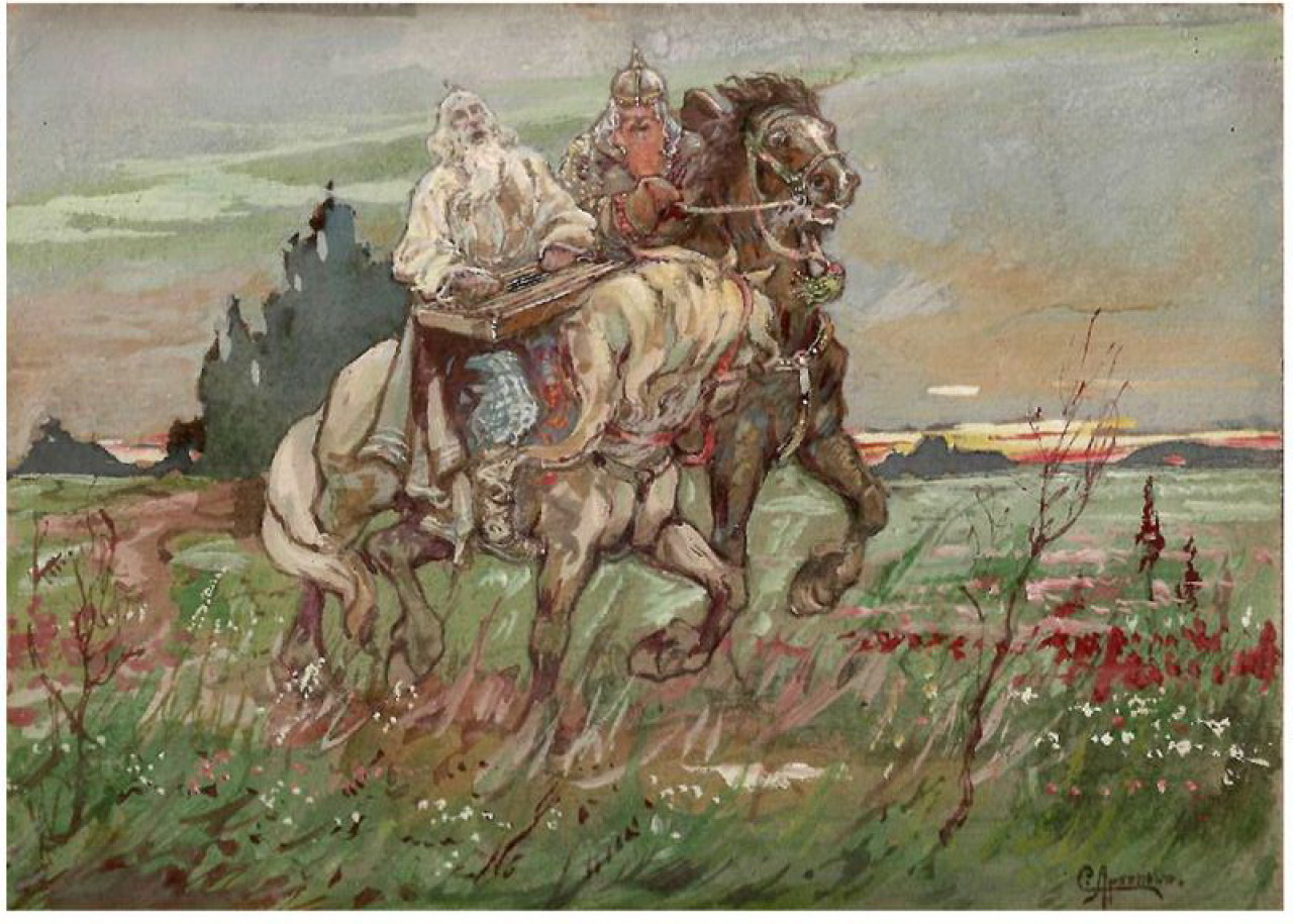 Архипов Сергей Николаевич «Былинный сюжет». 1910-е годы. Бумага на картоне, графитный карандаш, гуашь, белила. Размер: 15,2х21 см. В правом нижнем углу расположена подпись: «С. Архиповъ». По способу нанесения не вызывает сомнений в подлинности.