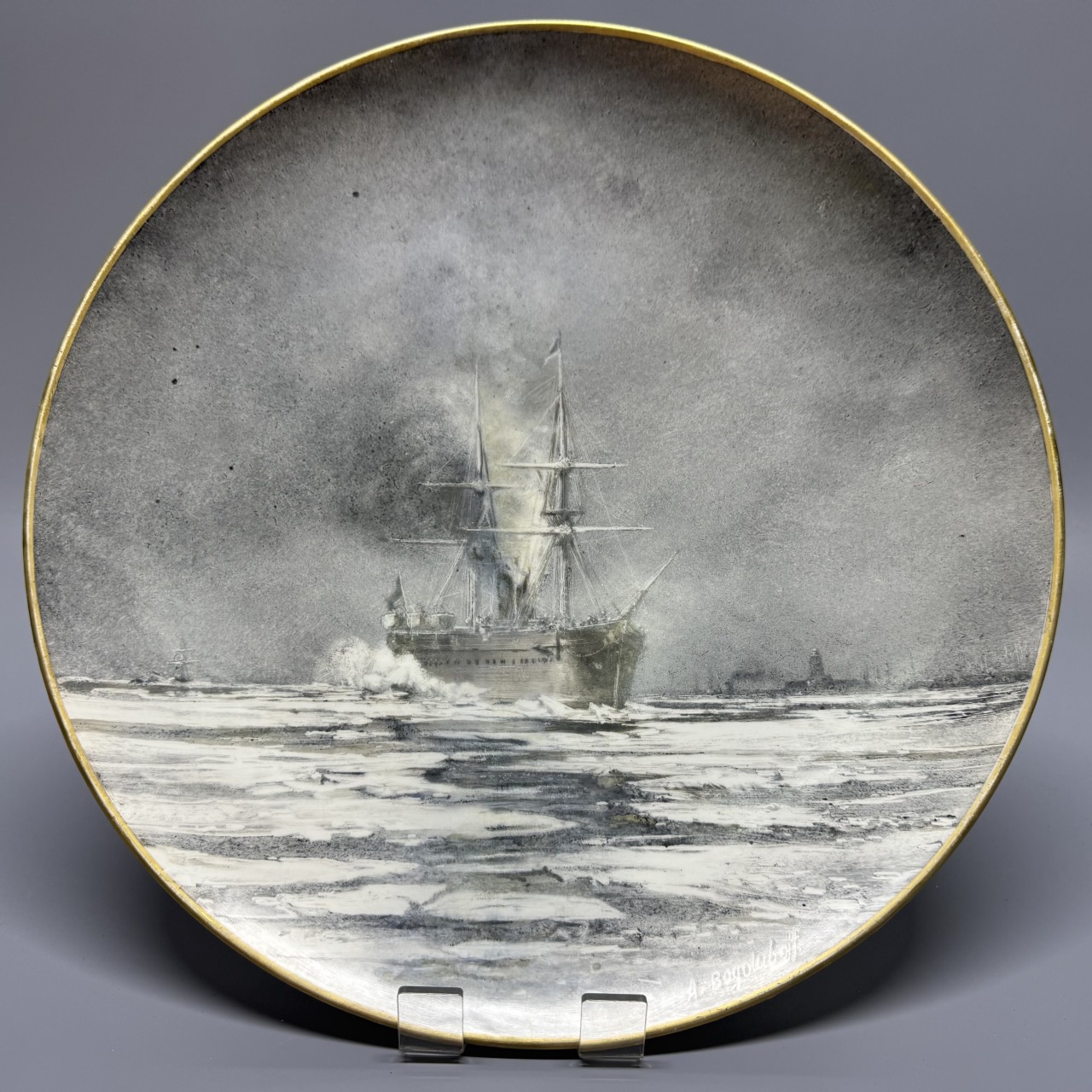 Блюдо Боголюбова А.П. «Корабль входит в порт» представляет собой редкий для частных собраний образец работы художника в технике росписи по керамике. По уровню исполнения и времени создания блюдо с композицией «Корабль входит в порт» (вторая половина 1870-х -начало 1880-х гг.) имеет музейное значение и представляет большой интерес для частных собраний русского искусства ХІХ века.