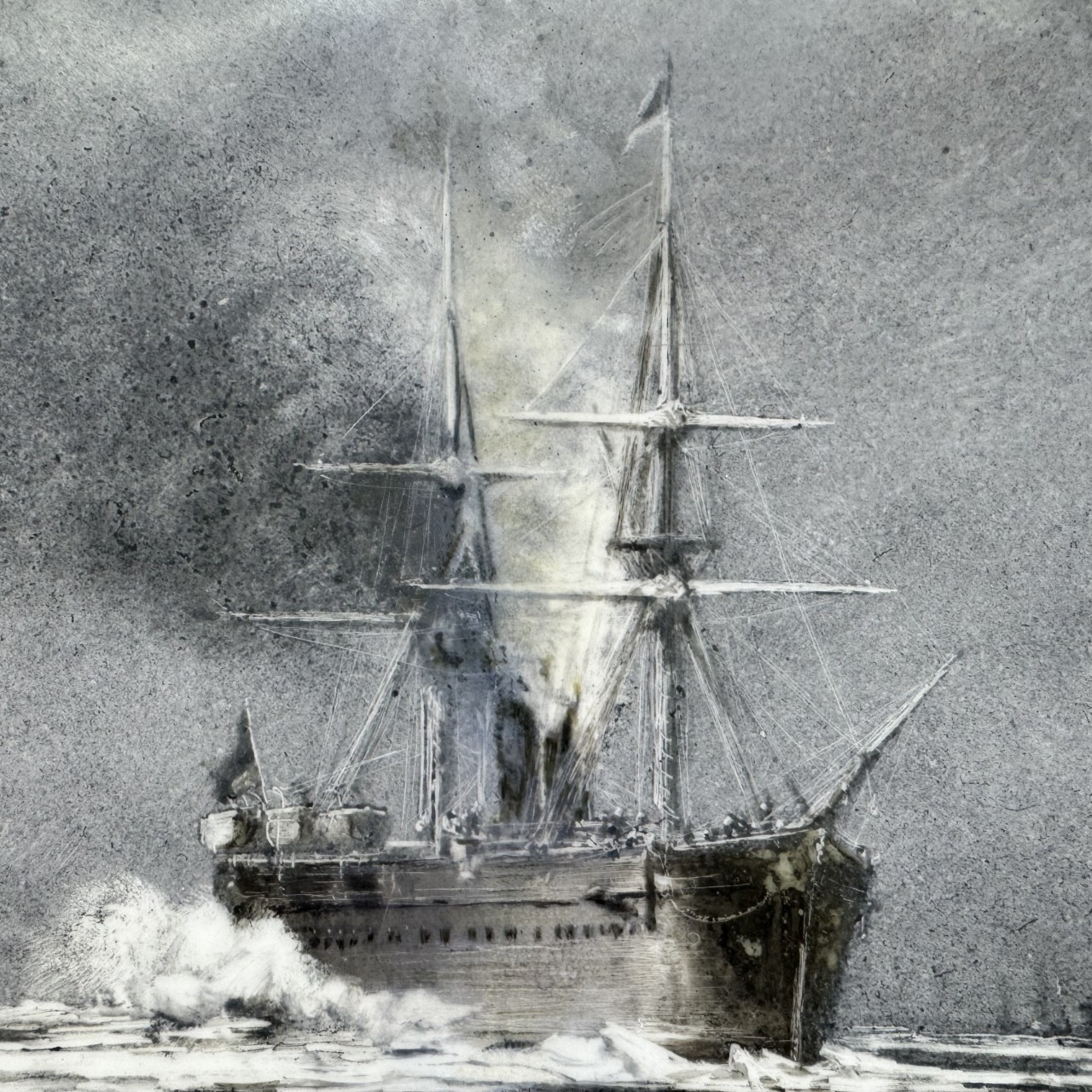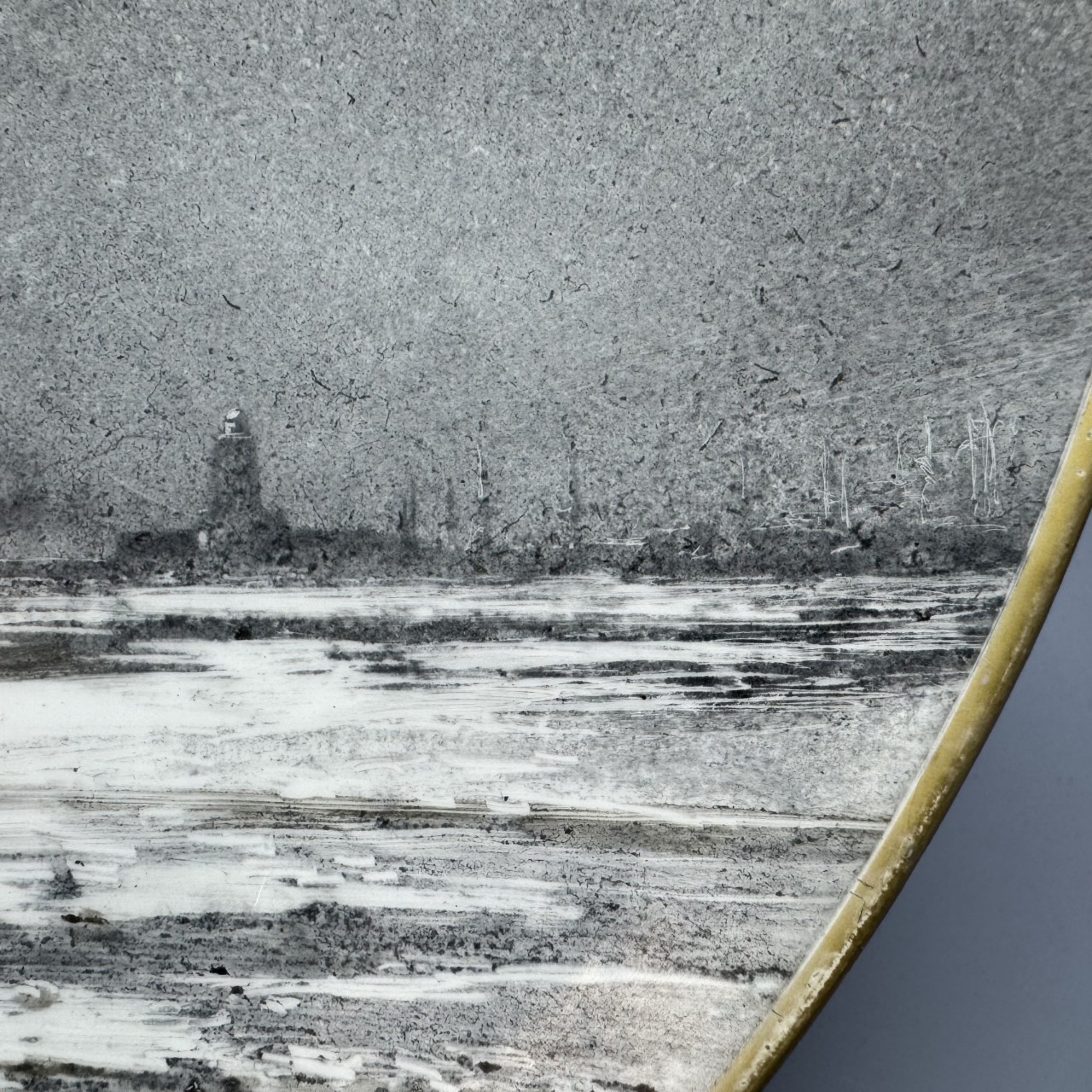 Композиция с кораблем в центре композиции и лаконичное цветовое решение с использованием одного или двух-трех цветов типичны для керамических росписей мастера. Метод письма по керамике более близок к акварели, однако Боголюбов и в этой технике продолжал работать с фактурой краски использовал различный нажим, процарапывание и другие приемы, особенно в изображении состояний воды и облаков. Особенности построения красочного слоя и характер мазка в изображении деталей данной росписи имеют аналогии среди работ художника на керамических основах, а также в ряде живописных и графических произведений.
