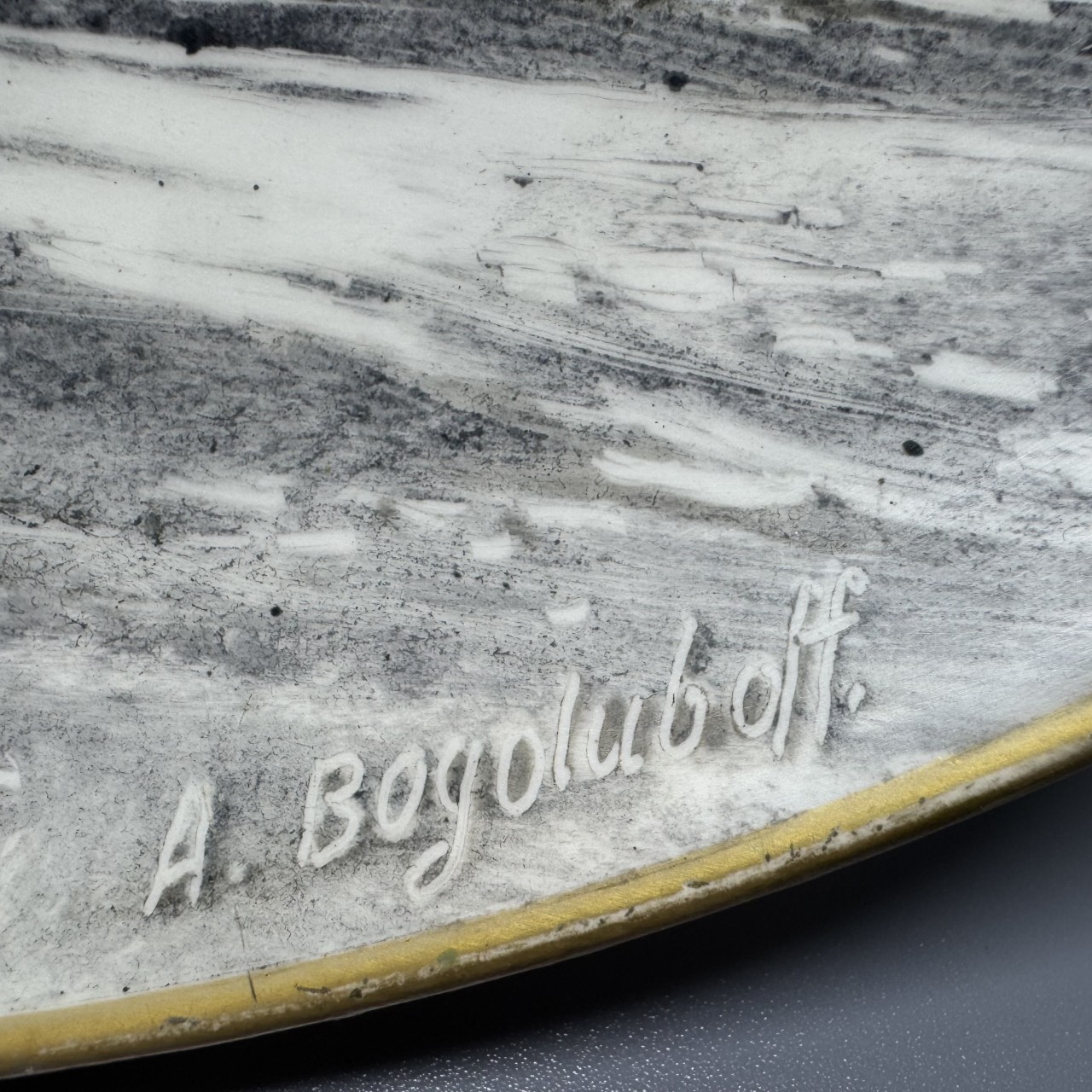 Стилистические и технологические особенности данной композиции сближают ее с известными керамическими произведениями А.П. Боголюбова, выполненными в технике подглазурной и надглазурной росписи. Большая часть таких предметов хранится в собрании Саратовского государственного художественного музея и была передана туда самим автором. Росписи Боголюбова на керамике датируются концом 1875 - 1882 годами. Размер основы диаметром 35 см. также характерен для данных работ.