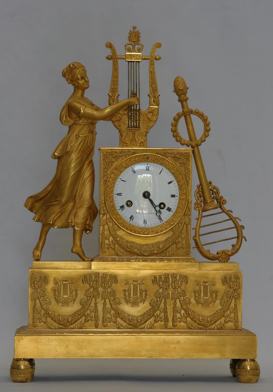 Изысканные каминные часы, покрытые позолотой, украшены фигурным изображением юной девы с лирой - популярного струнного музыкального инструмента античности, величественного символа ритмического звучания космоса, неземной гармонии, красоты и совершенства, эмблема творческого вдохновения, поэзии, искусства и просвещения.