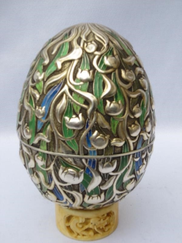 Шкатулка в виде пасхального яйца, выполненная в стиле русского модерна. Фабрика П.А. Овчинникова. 1892 год. Клейма: в овальном щитке изображение двуглавого орла, в прямоуольных щитках - клеймо-именник «ПО» одной из лучших, известнейших и ведущих ювелирных фирм Москвы - фабрики Овчинникова П.А., годовое клеймо пробирного мастера с инициалами «А.А.» и датой «1892» (Арцибашев Анатолий Апполлонович, раб. 1891-1896 гг.), 84 проба серебра, городской герб Москвы в виде Георгия Победоносца на коне, поражающего копьем змея.