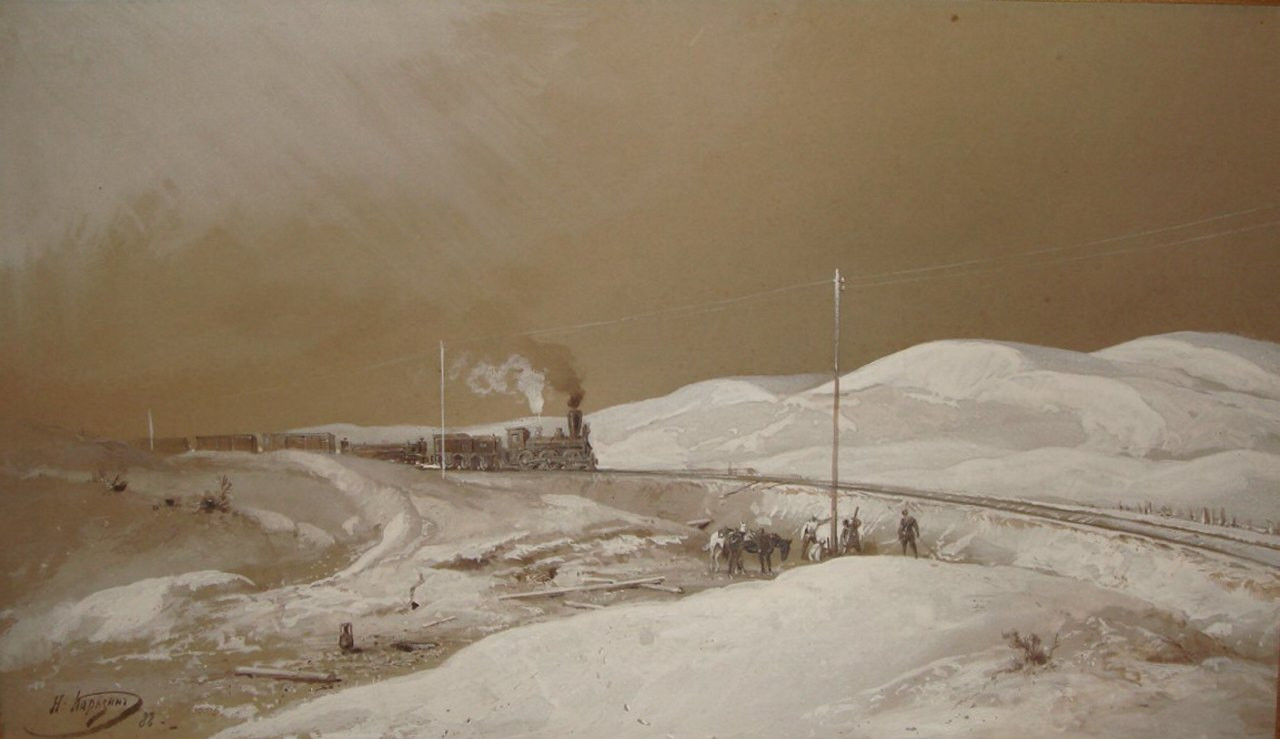 Каразин Николай Николаевич (1842 – 1908) «Закаспийская железная дорога», 1888 г. Бумага серая тонированная на картоне, сепия, белила. Слева внизу кистью подпись: «Н.Каразинъ 88.», как обычно в работах Н.Н.Каразина. исполнена кистью и сомнений в подлинности не вызывает. Она, безусловно, является автографом художника, дата – авторской.
