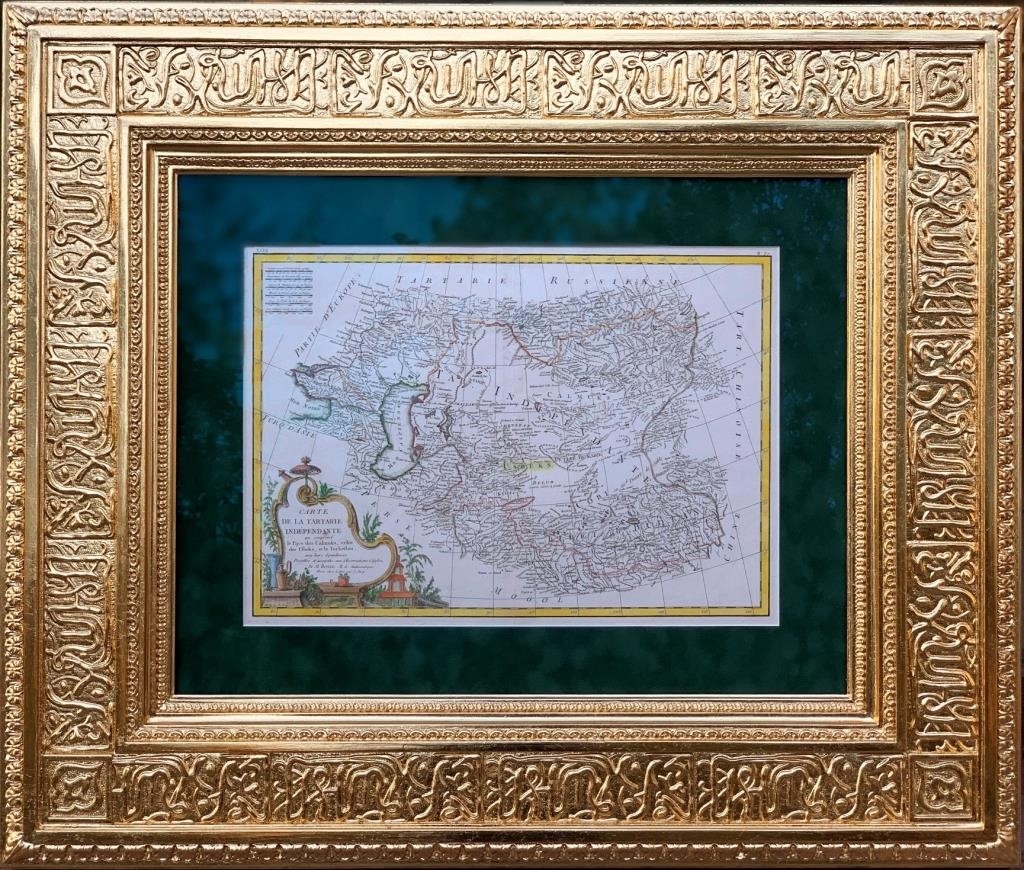 Карта Независимой Тартарии, которая включает Земли Кальмыков, Земли Узбеков и Туркестана, с сопредельными странами, представлены с учетом астрономических наблюдений г-ном Бонне Ригобером (Charles Marie Rigobert Bonne, 1727-1794), королевским гидрографом. (Carte de la Tartarie Independante qui comprend le Pays des Calmuks, celui des Usbeks, et le Turkestan, avec leurs dependances, projettee et assujettie aux observations celestes, par M. Bonne, Hydrographe du Roi.). 1778 год. Бумага; резцовая гравюра на медной доске, акварель.
