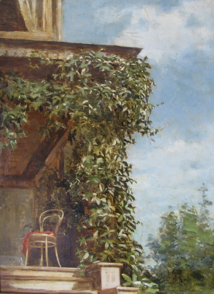 Клевер Юлий Юльевич (сын) (1882 — 1942) «Терраса», 1908 год. Холст, масло. Подпись и дата справа внизу: «Ю.Клеверъ (сынъ) 1908 г.», - по способу нанесения и характеру начертания сомнений в подлинности не вызывают. Состояние живописных материалов данной работы не противоречит указанной в подписи дате — 1908 г.