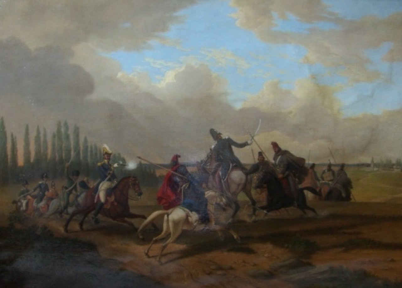 НЕИЗВЕСТНЫЙ ХУДОЖНИК «НАПАДЕНИЕ КАЗАКОВ НА СВИТУ ВИЦЕ-КОРОЛЯ ИТАЛИИ ЕВГЕНИЯ БОГАРНЕ ПОД МАГДЕБУРГОМ В 1813 ГОДУ»