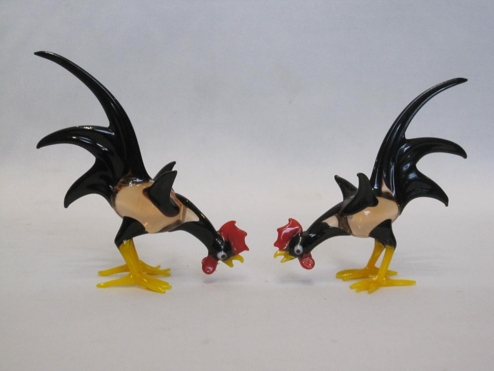 Парные фигурки «Бойцовые петухи». Германия, середина ХХ века. Цветное (сульфидное) стекло.