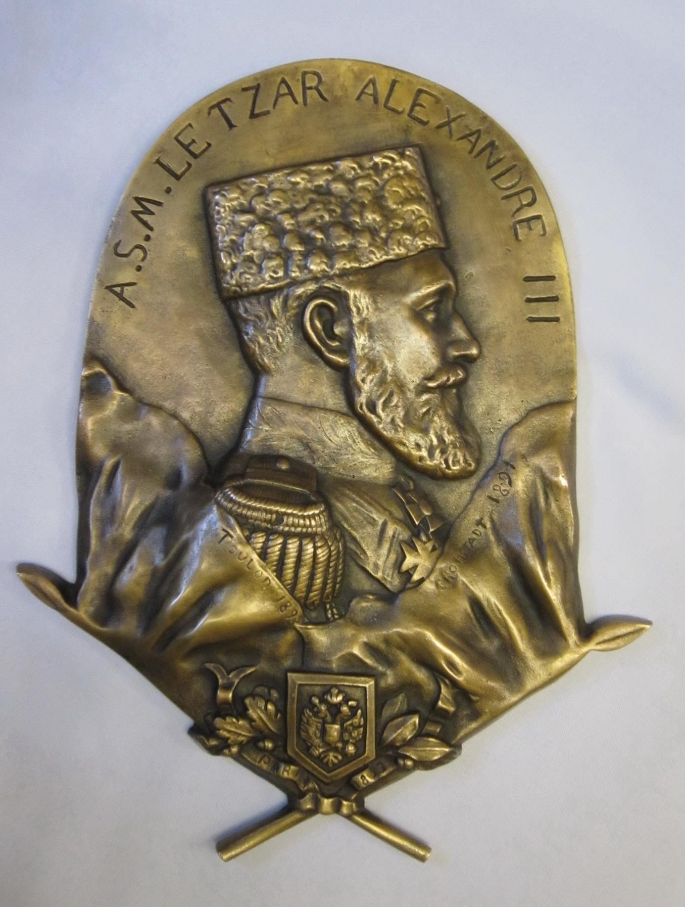Декоративная плакетка с бюстом Александра III, посвященная франко-русскому военно-экономическому альянсу, «A.S.M. LETZAR ALEXANDRE III», в обрамлении развевающихся знамен. Франция, Париж, 1893 год. Надпись на левом флаге «Toulon 1893» и надпись на правом флаге «Cronstadt 1893». Бронза, литье, патинирование.
