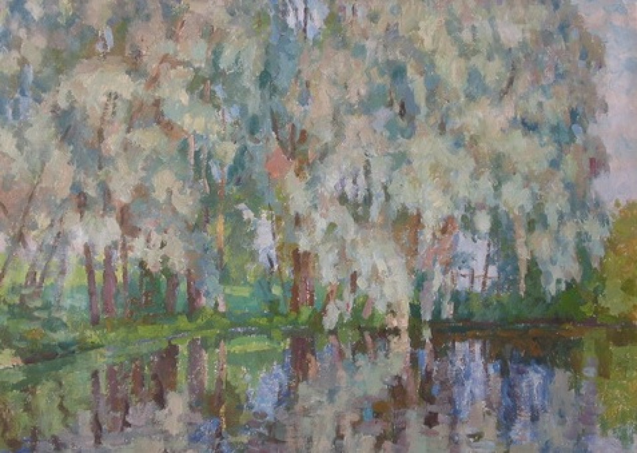 Покаржевский Петр Дмитриевич (1889 1968) «Деревья у пруда», конец 1950-х — 1960-е гг. Картон, масло. Слева внизу расположена подпись: «П.Покаржевский», - нанесенная спустя непродолжительное время после создания работы. По характеру начертания подпись аналогична эталонным автографам автора.