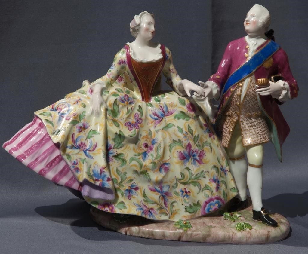 Скульптурная композиция «Кринолиновая пара» («Леди и джентльмен»). Германия, середина XIX века. Германия, Мейсенская фарфоровая мануфактура (Мейсен, Meissen). Модель: Иоганн Иоахим Кендлер (Johann Joachim Kändler, 1744 год). Фарфор, роспись.
