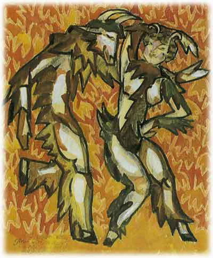 Судейкин Сергей Юрьевич (1882-1946) «Танец козлоногих», середина 1910-х годов. Бумага верже на картоне, гуашь, темпера, уголь, восковой карандаш, красная тушь, кисть. Размер: 48,8х41 см. Слева внизу кистью подпись и авторская надпись: С.Судейкинъ "Пробуждение Пана". Балетъ Костюмы козлоногих.