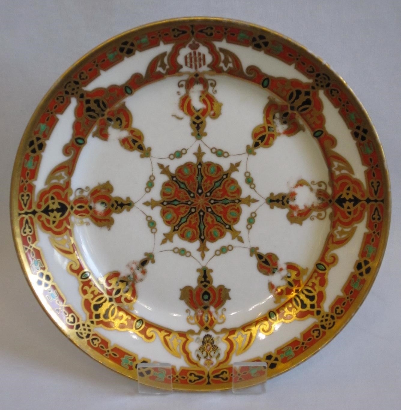 Тарелка из сервиза Великого Князя Константина Николаевича с монограммой «ВККН». Российская империя, Императорский фарфоровый Завод (ИФЗ). Предмет из парадного сервиза, исполненного к свадьбе Великого Князя Константина Николаевича и принцессы Саксен-Альтенбурской (после перехода в православную веру - Великая Княгиня Александра Иосифовна). Проект 1848 года. Автор проекта Солнцев Федор Григорьевич. Фарфор, надглазурная полихромная роспись, золочение, цировка. Диаметр - 22 см. Марка синяя, подглазурная: НI под короной, метка золотая.