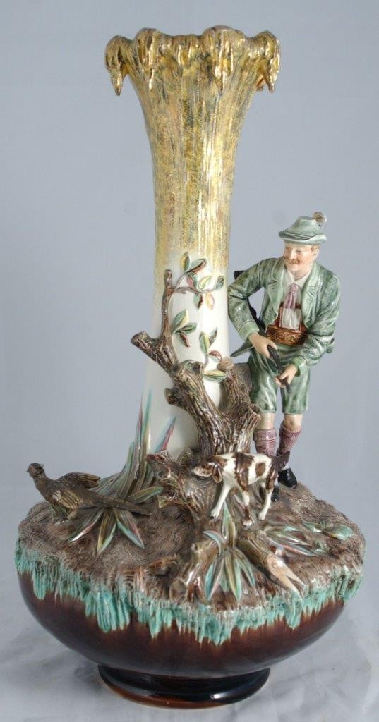 Ваза «Охотник с собакой». Германия, конец XIX века, фаянсовая мануфактура Ансбах (Ansbach). Фаянс, металлический сплав, формовка, лепка, глазурование, кистевая над- и подглазурная роспись эмалями, золотом. На основании поглазурно – «щит» под короной, «1648», «К». Высота – 56 см.