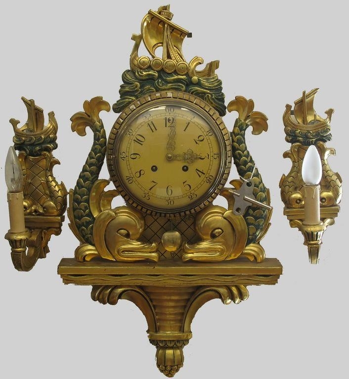Гарнитур: настенные часы (т.н. «картель») и два бра (электрифицированные) является оригинальным, стильным и редким образцом заказных, художественных интерьерных изделий шведского изготовления в стиле модерн (т.н. «скандинавского модерна» - «стиль викингов»). По своим художественно-стилистическим признакам, технике изготовления в материале, специфике декоративного золочения и патинирования (модной для модерна зеленой патины), особенностям типологии, все предметы, входящие в гарнитур, могут быть датированы 1900-ми годами, и отнесены к эксклюзивным изделиям шведских мастеров, воспроизводящих в дереве (характерно для Швеции) образцы художественной бронзы начала ХХ века. Гарнитур выполнен на высоком художественном и техническом уровне, отличается стильностью, и рафинированностью своего художественно-декоративного решения.