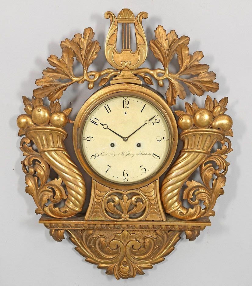 Данные резные часы являются оригинальным, стильным и редким образцом заказных, художественных интерьерных изделий шведского изготовления в стиле барокко. По своим художественно-стилистическим признакам, технике изготовления в материале, специфике декоративного золочения, особенностям типологии и имени производителя - Carl August Wasfberg (1768 – 1810), могут быть датированы концом XVIII века, и отнесены к эксклюзивным изделиям шведских мастеров, воспроизводящих в дереве (характерно для Швеции) образцы художественной бронзы конца XVIII – начала XIX века. Настенные часы выполнены на высоком художественном и техническом уровне, отличается стильностью, и рафинированностью своего художественно-декоративного решения.