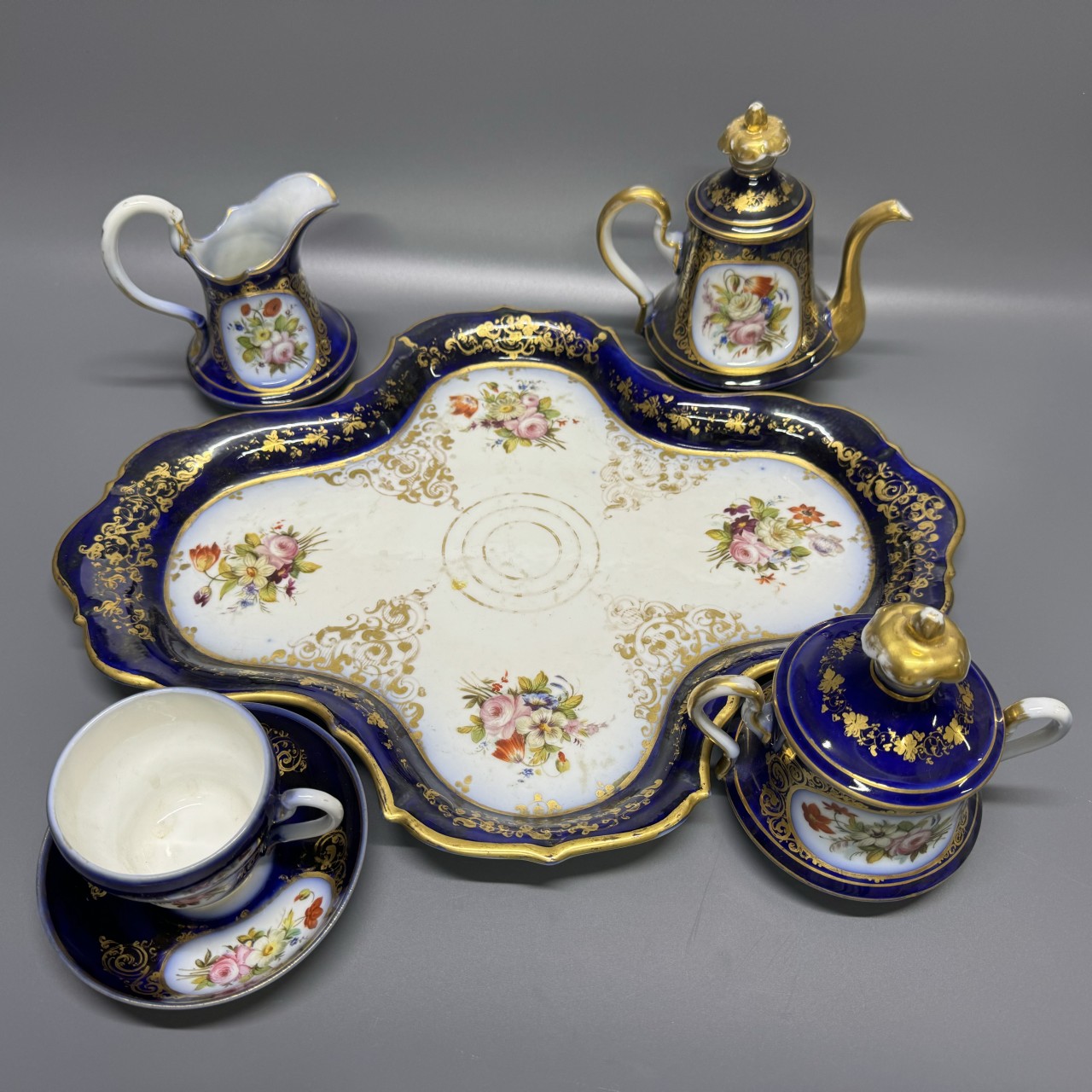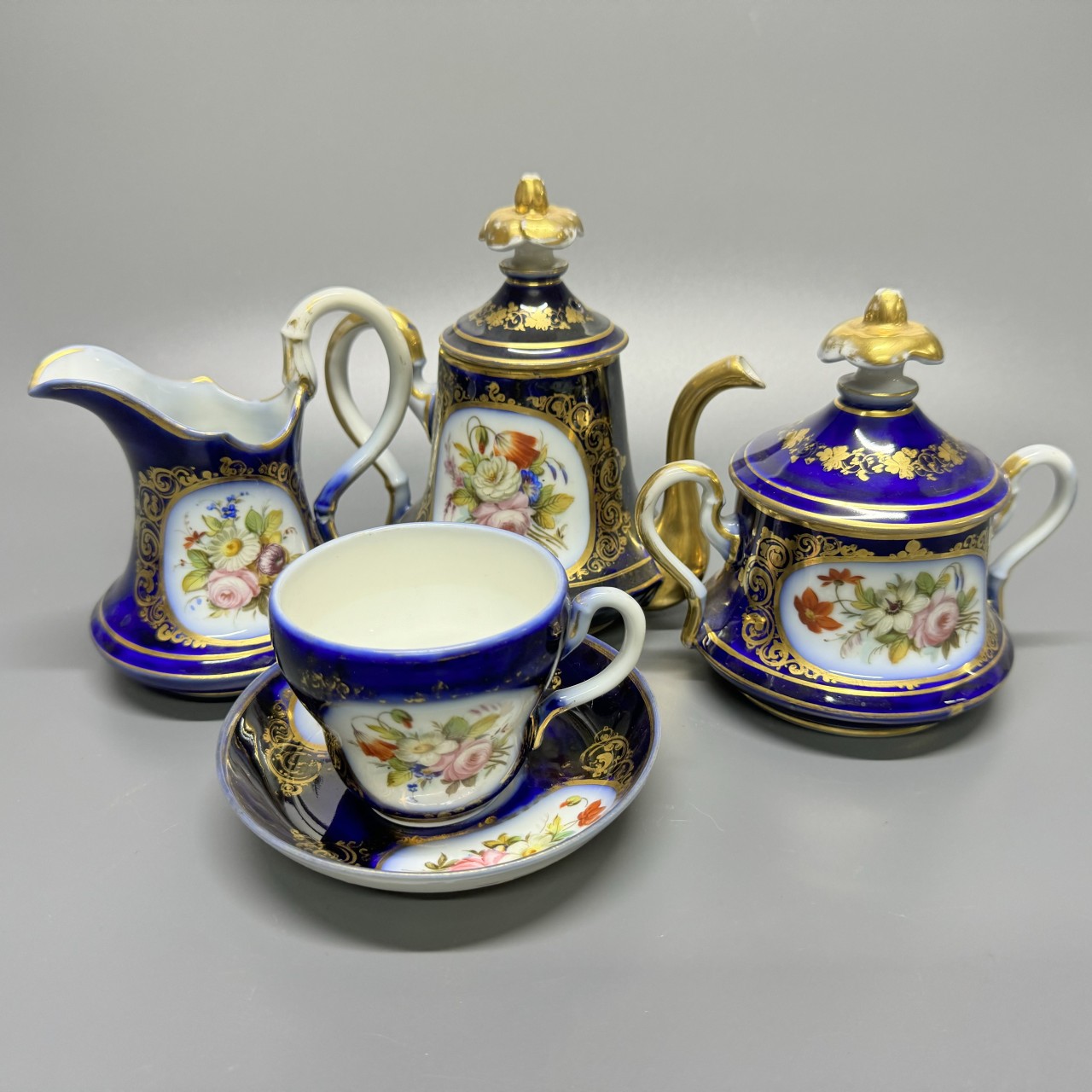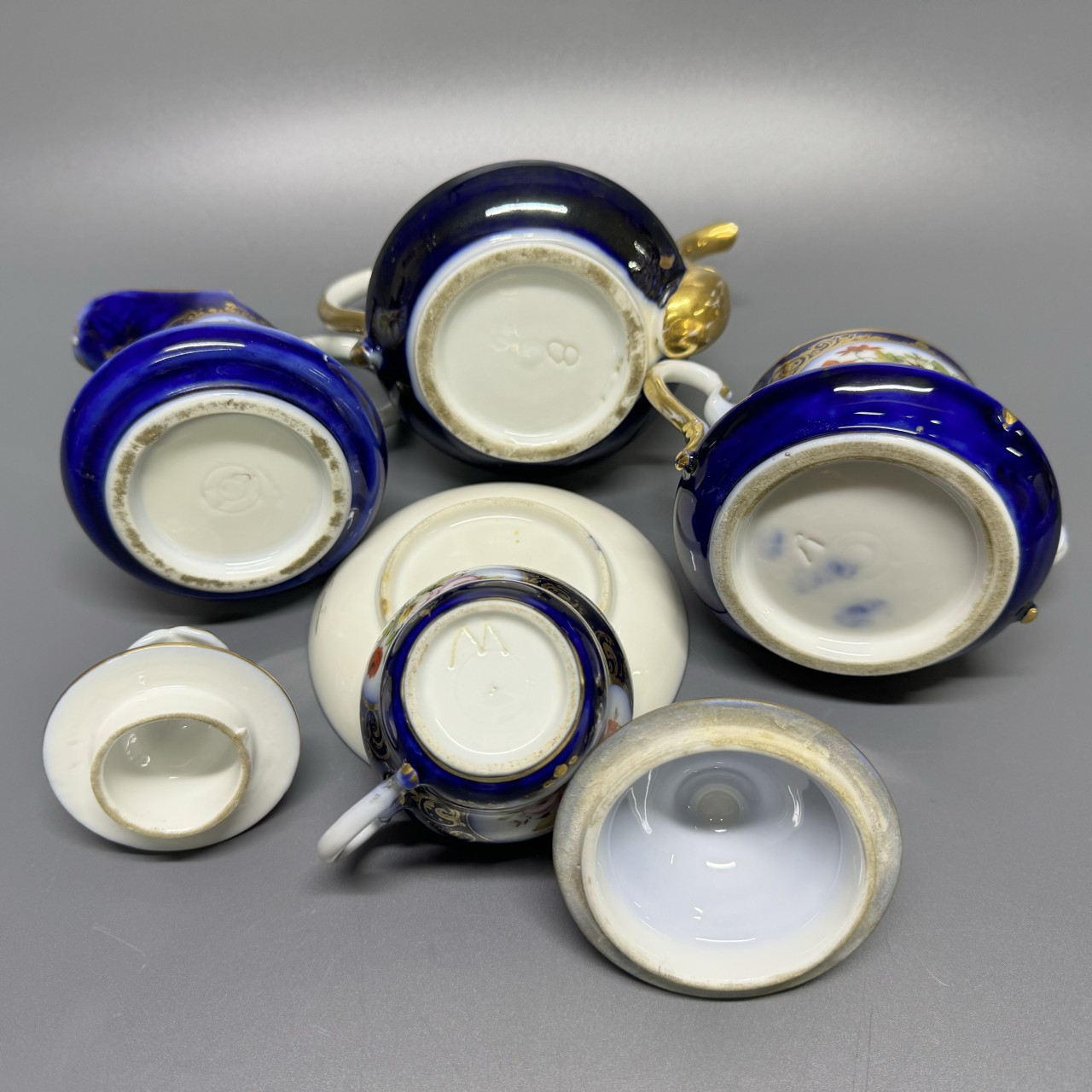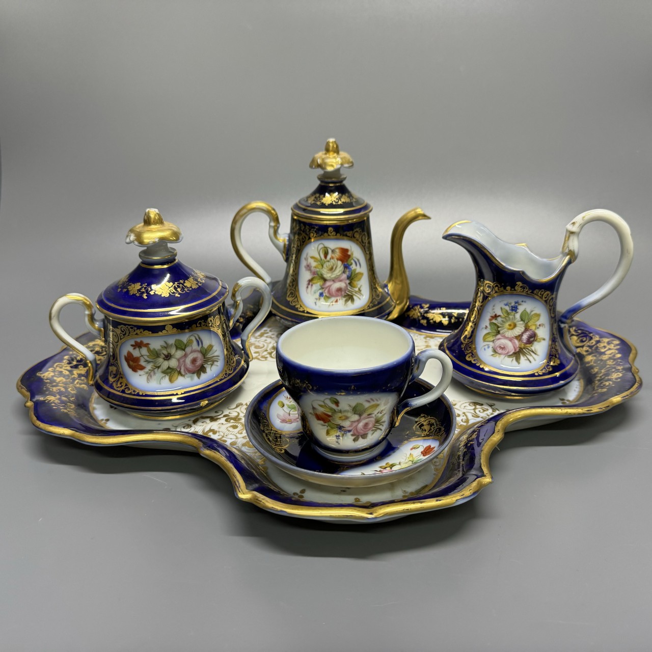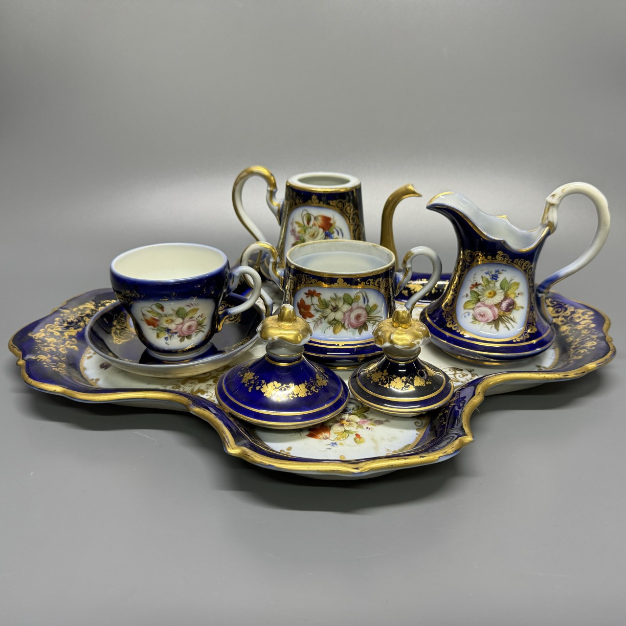 Чайный сервиз «Эгоист». Франция, 1880-е годы. Фарфор, крытье кобальтом, полихромная роспись.