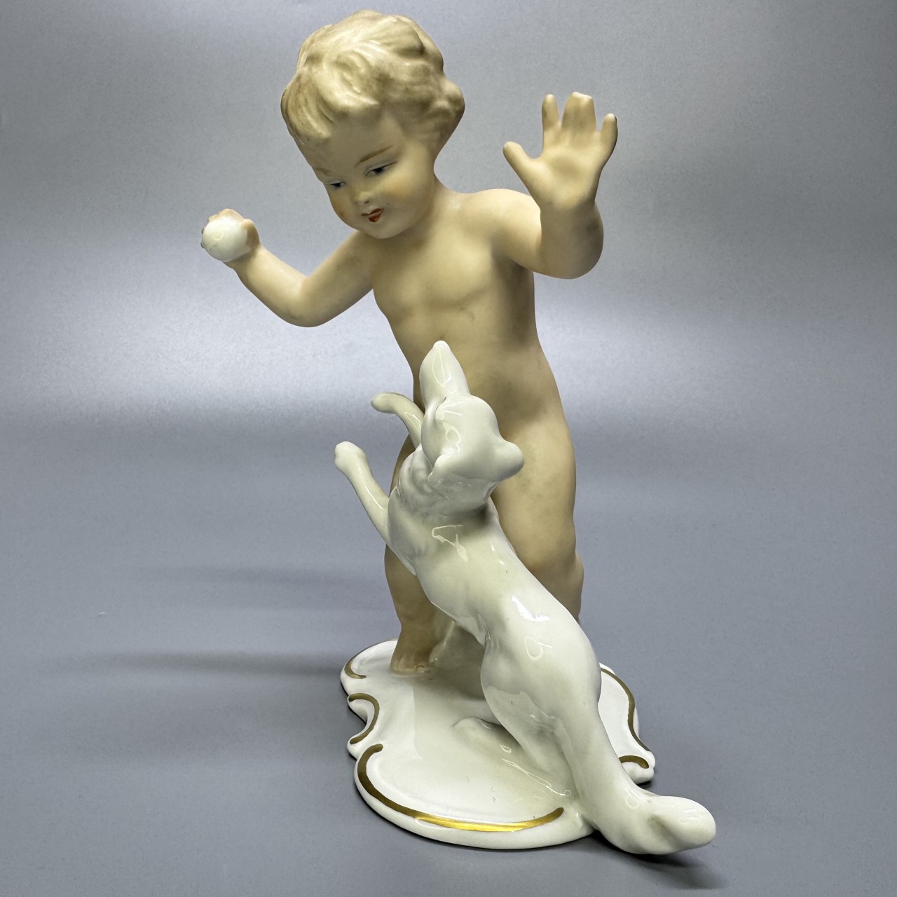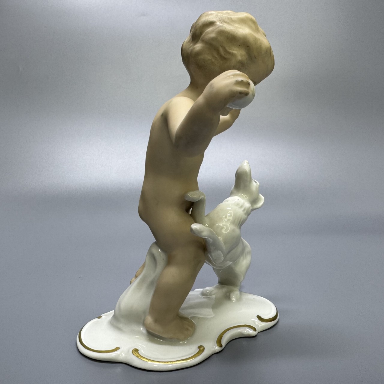 Фигура «Путти, играющий с собакой». Германия (ГДР), Wallendorf, Schaubach Kunst (Валлендорф, Шаубах Кунст), 1963–1980 годы. Фарфор, роспись, золочение.