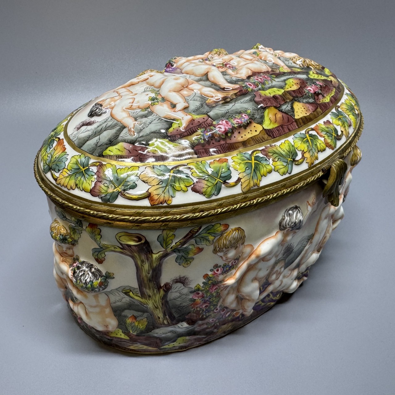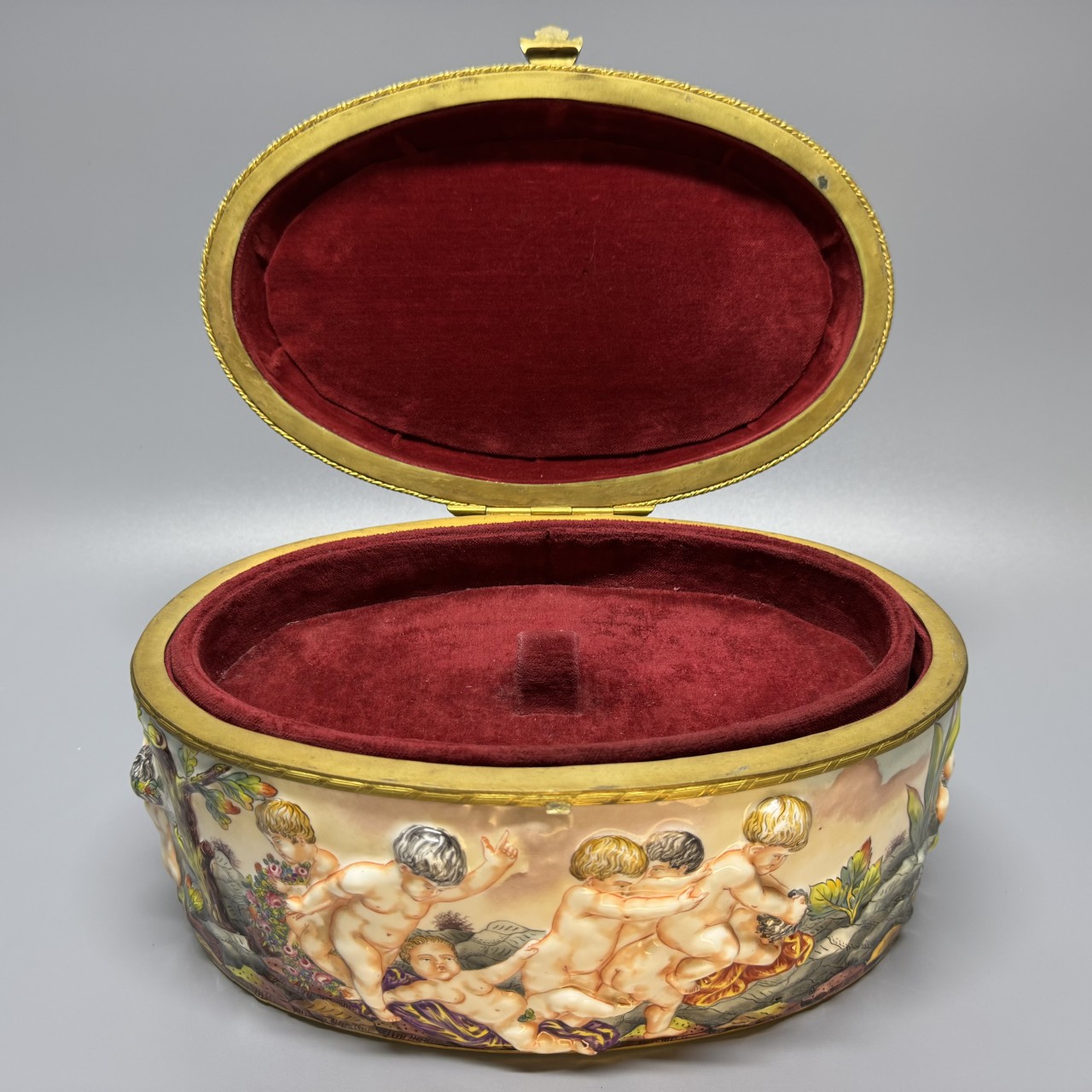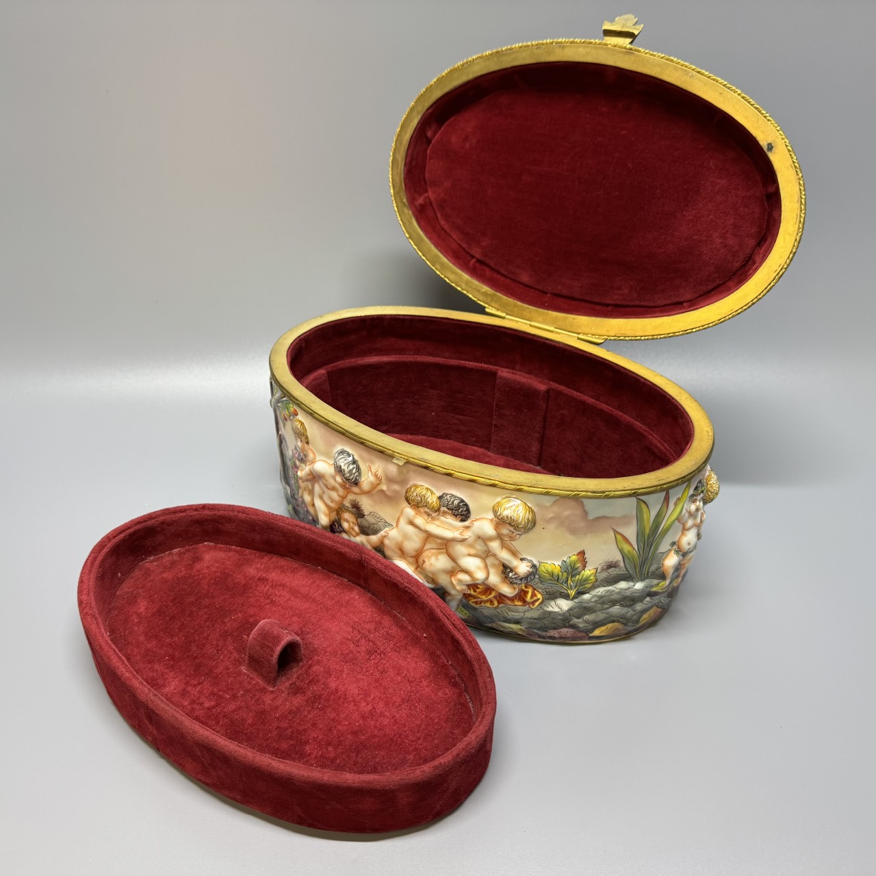 Шкатулка «Мифологическая сцена». Италия, Каподимонте, середина ХХ века. Фарфор, роспись, золочение, металл, бархат (внутри).