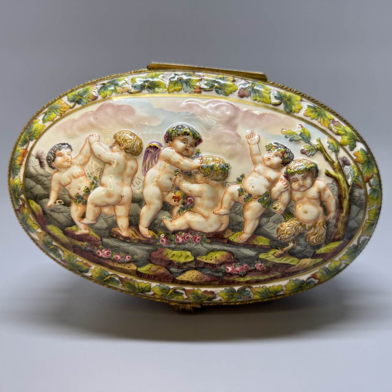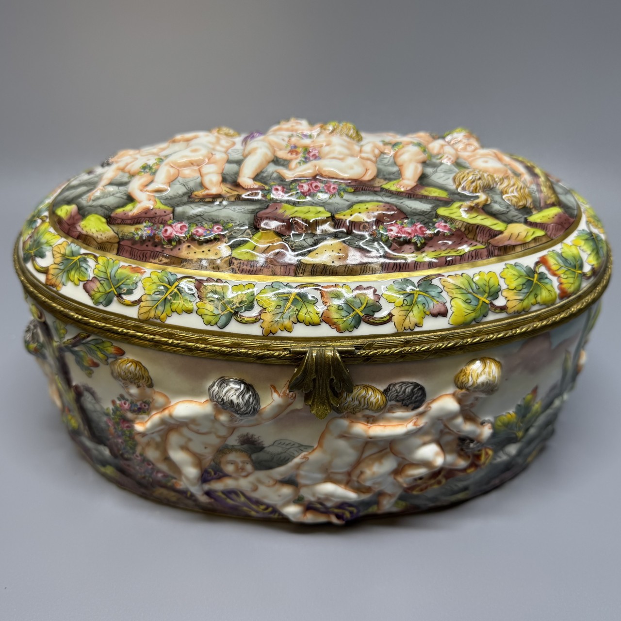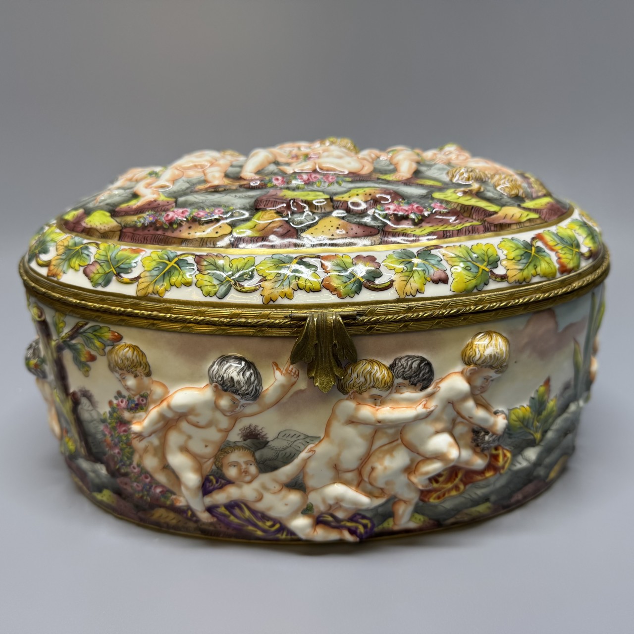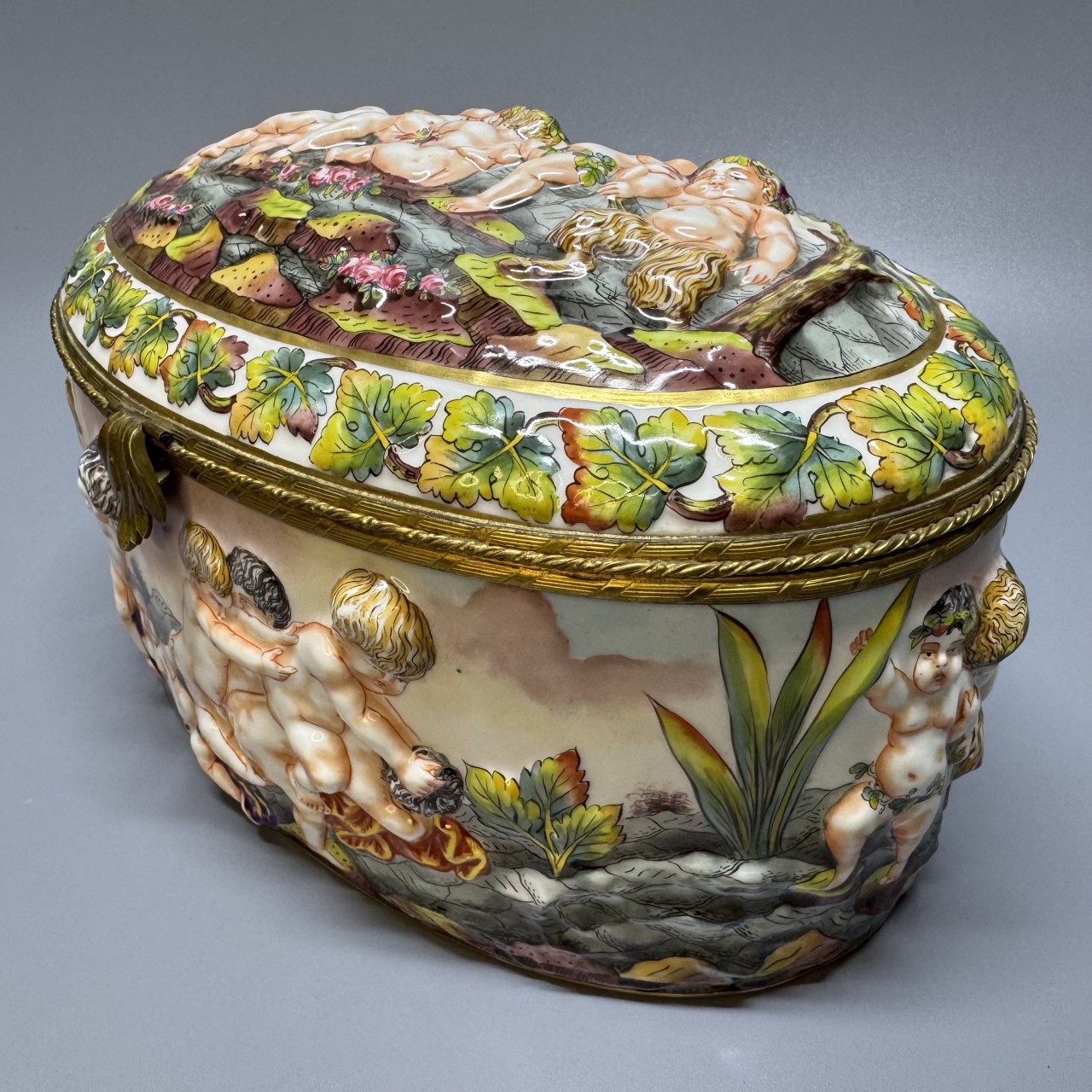 Шкатулка «Мифологическая сцена». Италия, Каподимонте, середина ХХ века. Фарфор, роспись, золочение, металл, бархат (внутри).