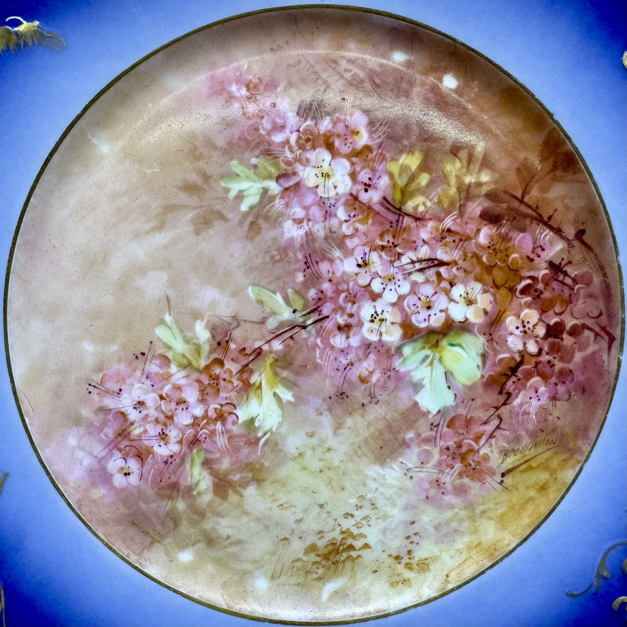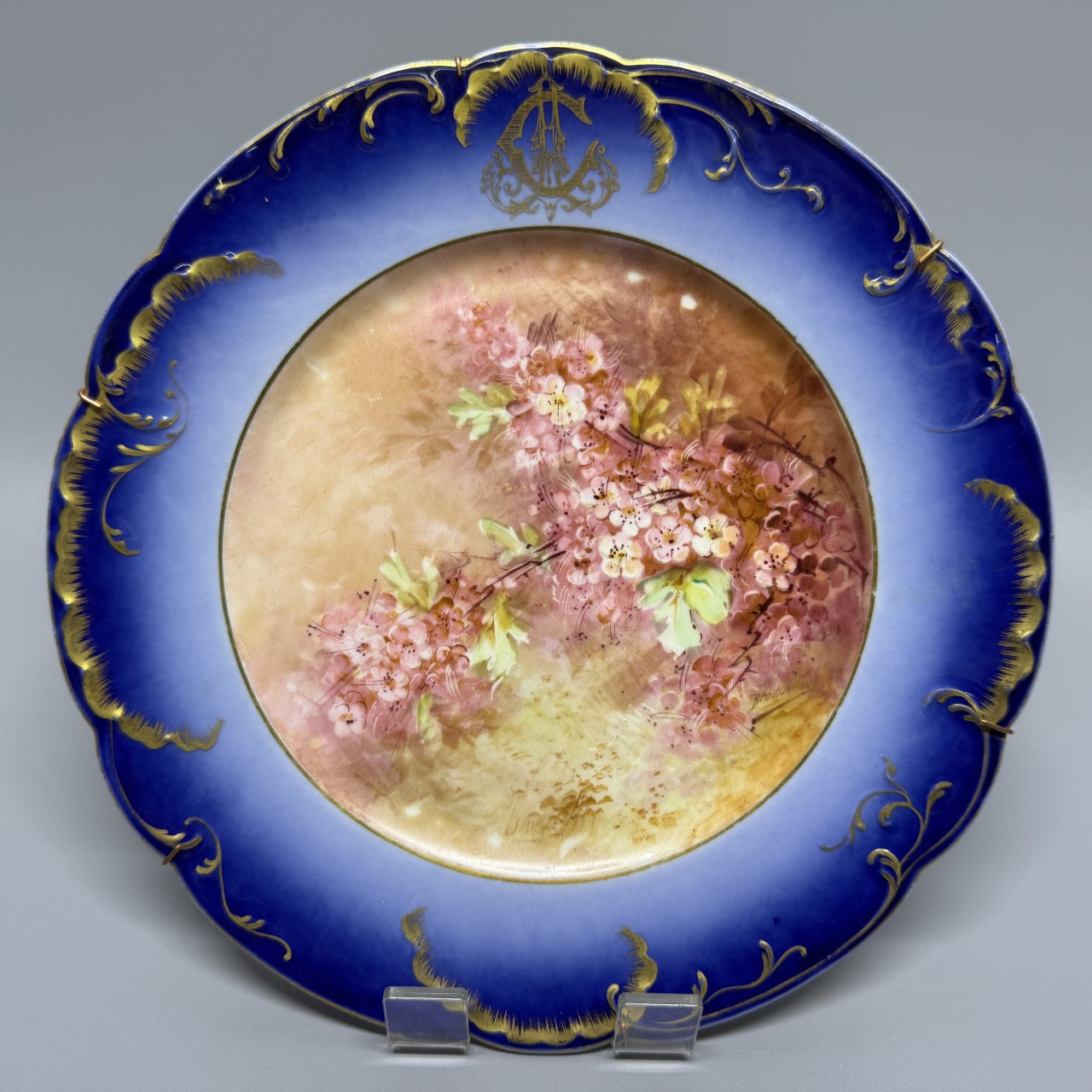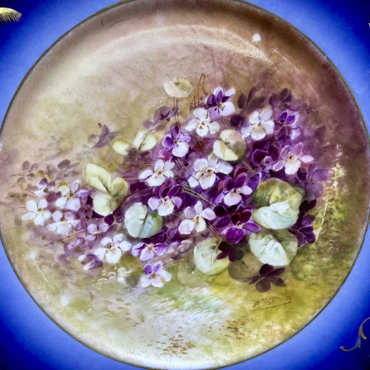 Тарелки декоративные «Фиалки» с монограммой. Франция, Лимож (Limoges), начало ХХ века. Художник: Aifred Broussillon (1856-1922). Фарфор, крытье кобальтом, роспись, золочение.
