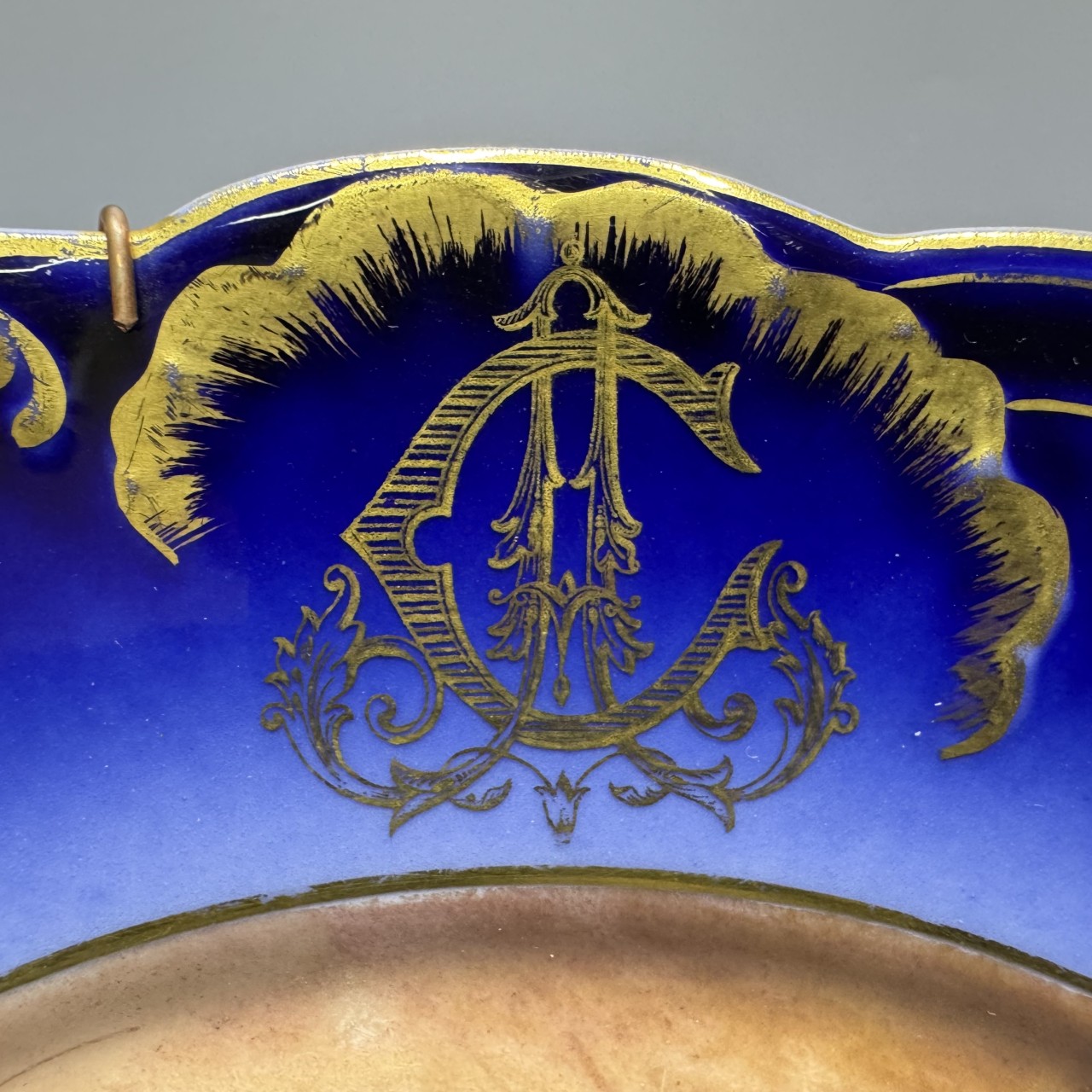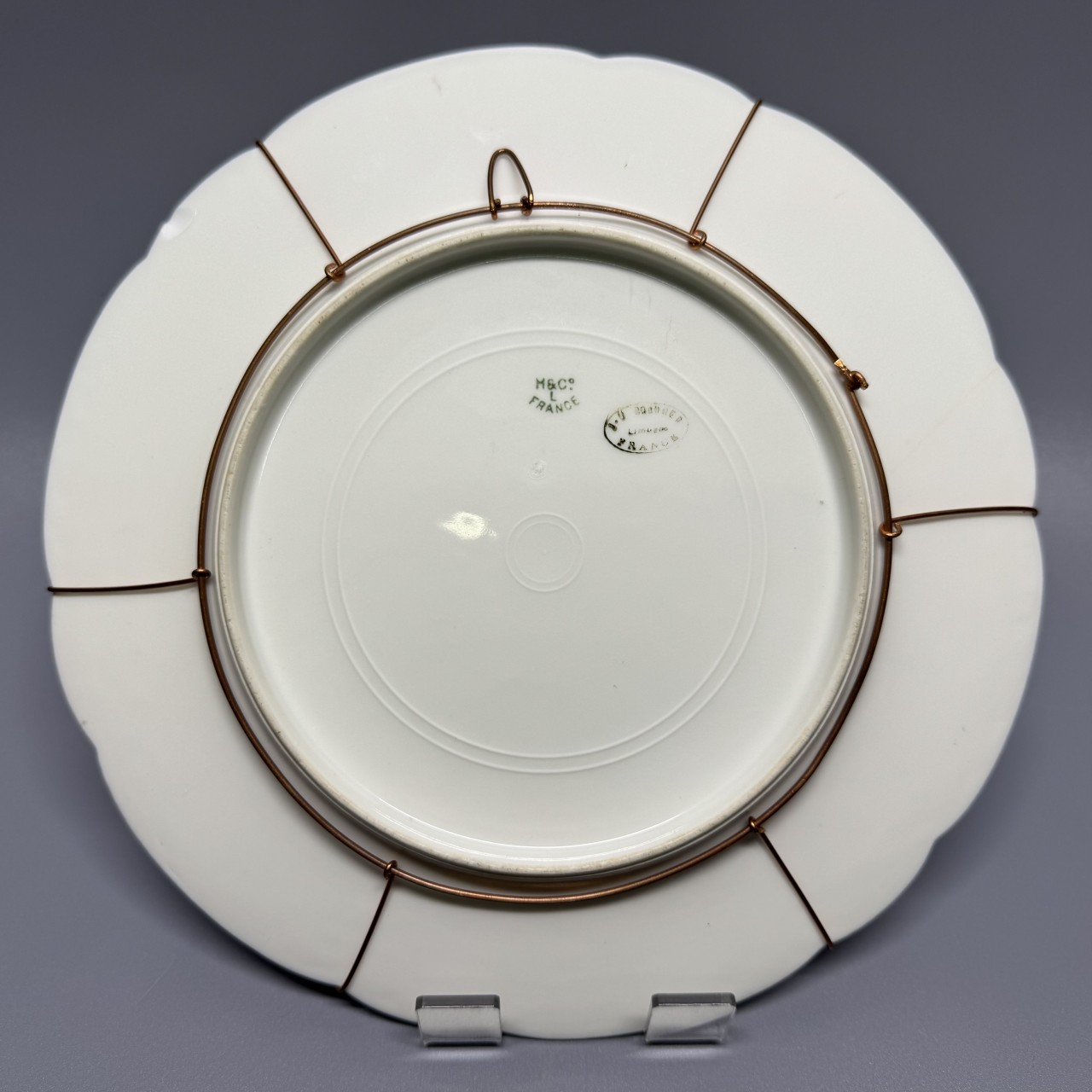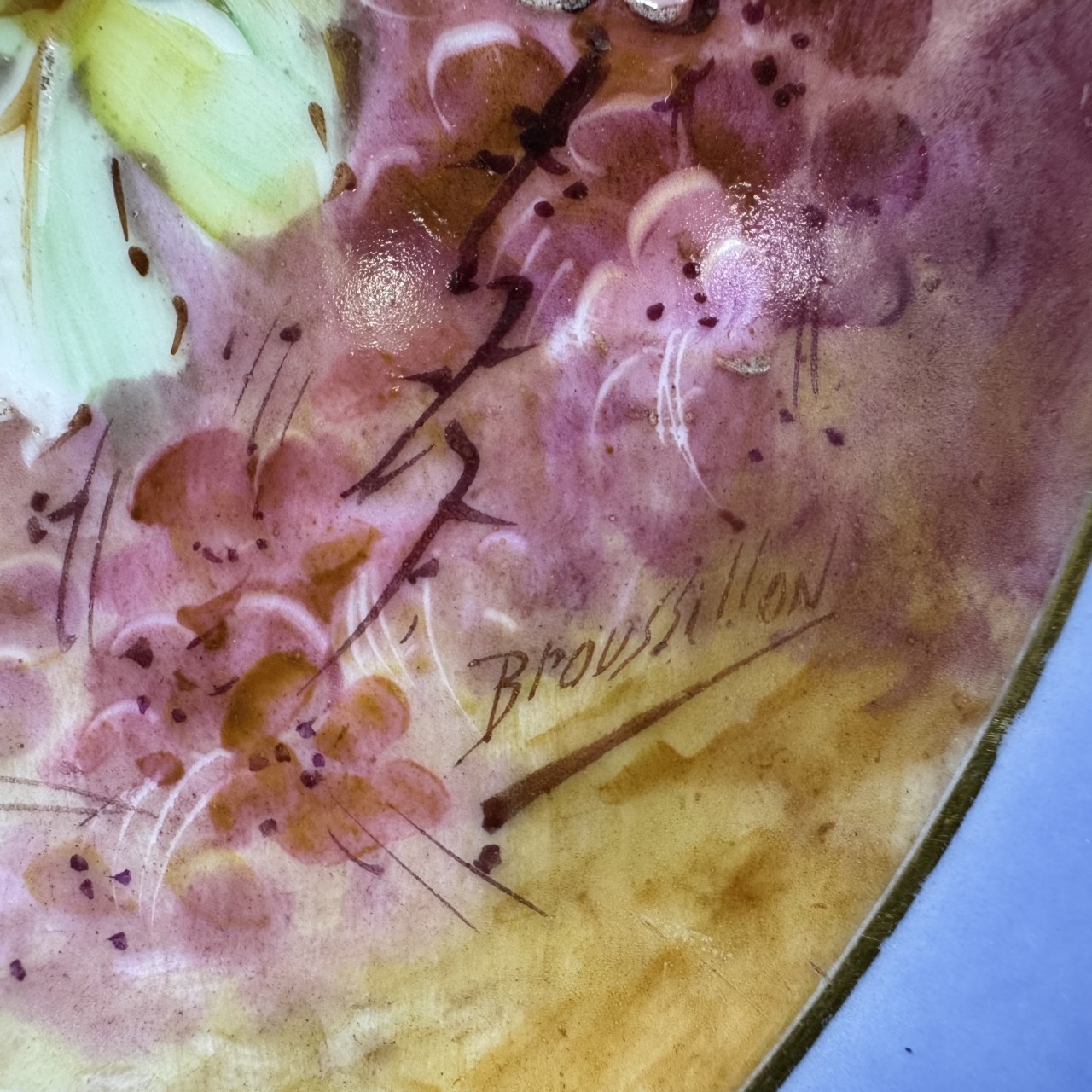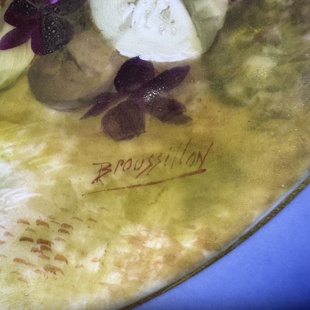 Тарелки декоративные «Фиалки» с монограммой. Франция, Лимож (Limoges), начало ХХ века. Художник: Aifred Broussillon (1856-1922). Фарфор, крытье кобальтом, роспись, золочение.