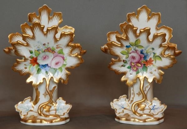 Вазы парные в форме листьев с изображением цветов. Европа, вторая половина XIX века. Фарфор, роспись, золочение.