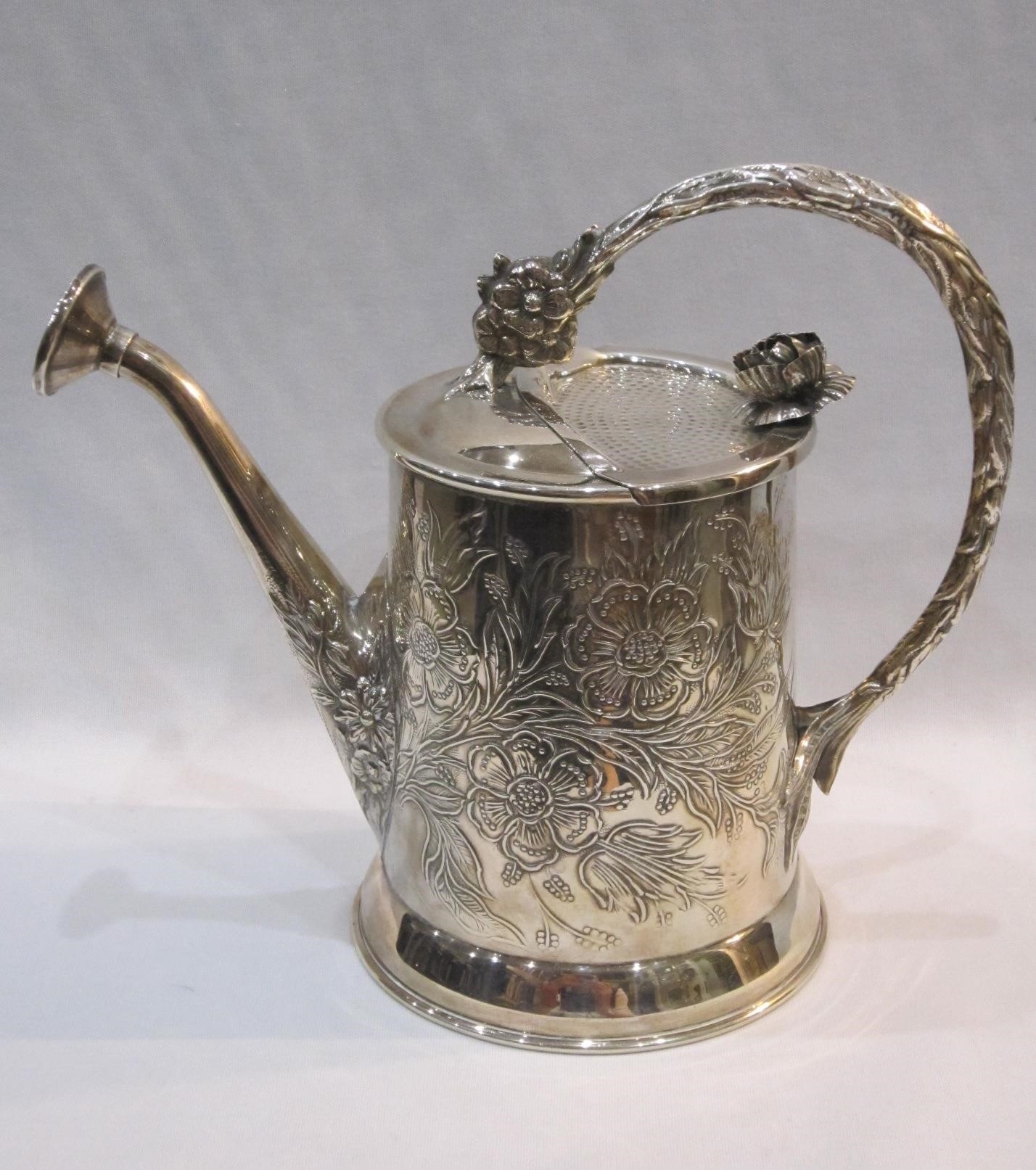 Леечка с цветочным орнаментом для полива комнатных растений. Испания, середина ХХ века. Серебро, клеймо 925. Вес - 407 грамм.