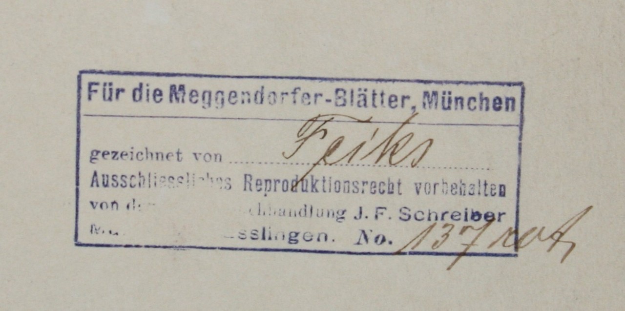 Справа в нижнем углу имеется авторская подпись: «Eugen Feiks». На обороте имеется штамп издания с указанием номера.