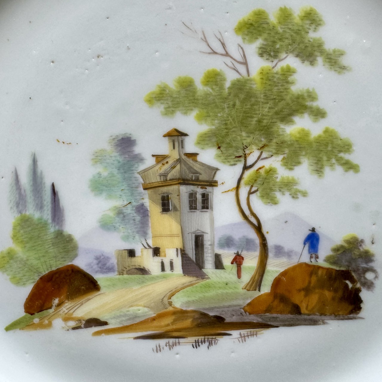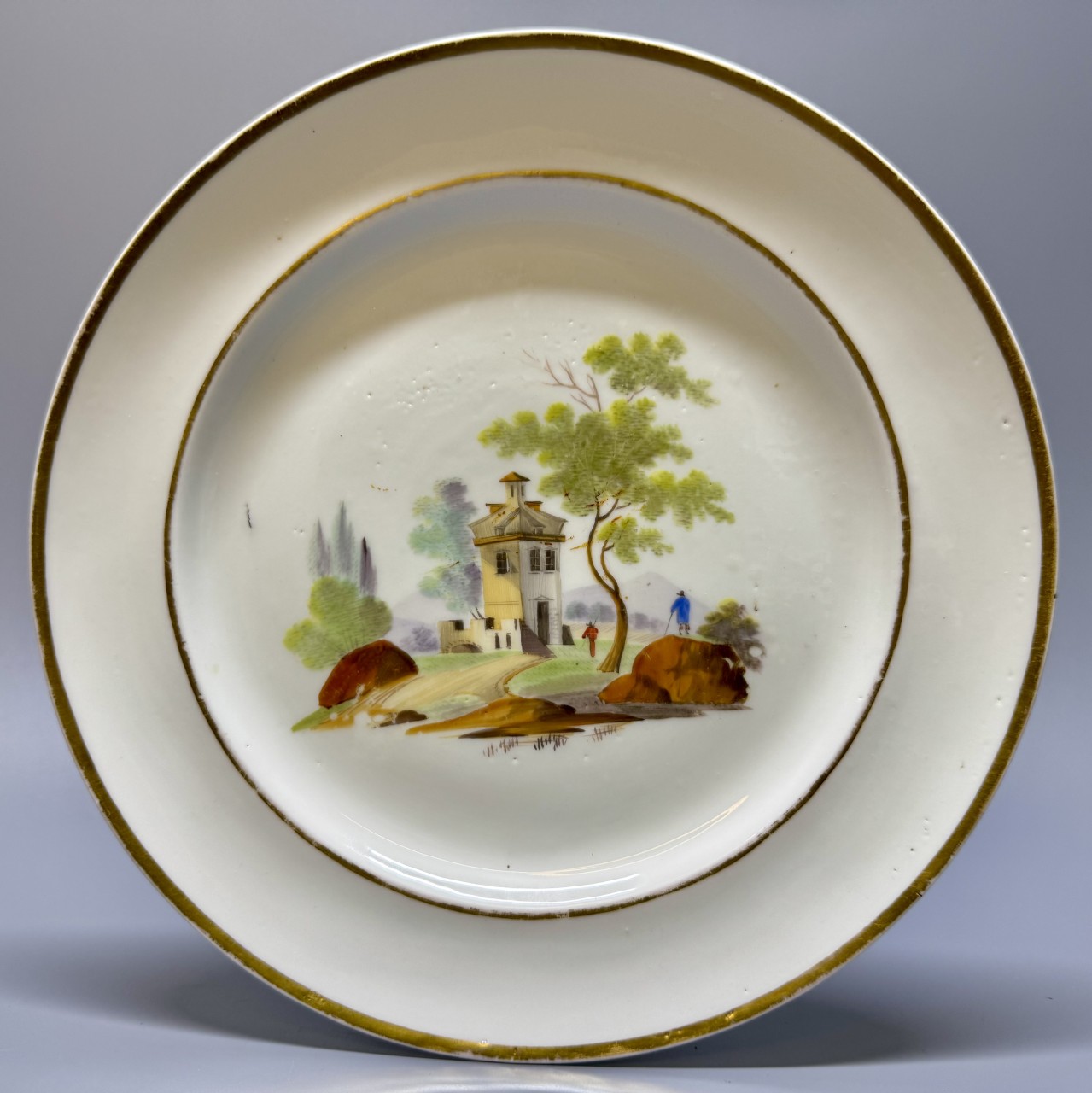 Тарелка с изображением пейзажа. Россия, конец XVIII века, 1770-1780-е гг. , фабрика Гарднера. Фарфор, роспись, золочение.