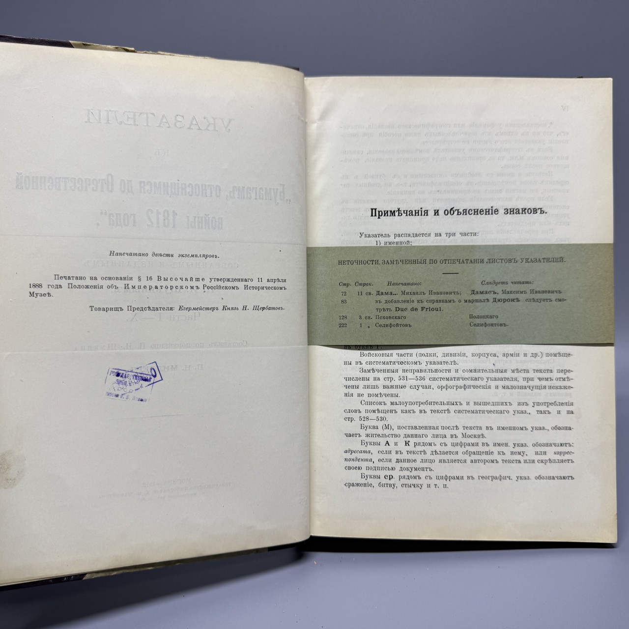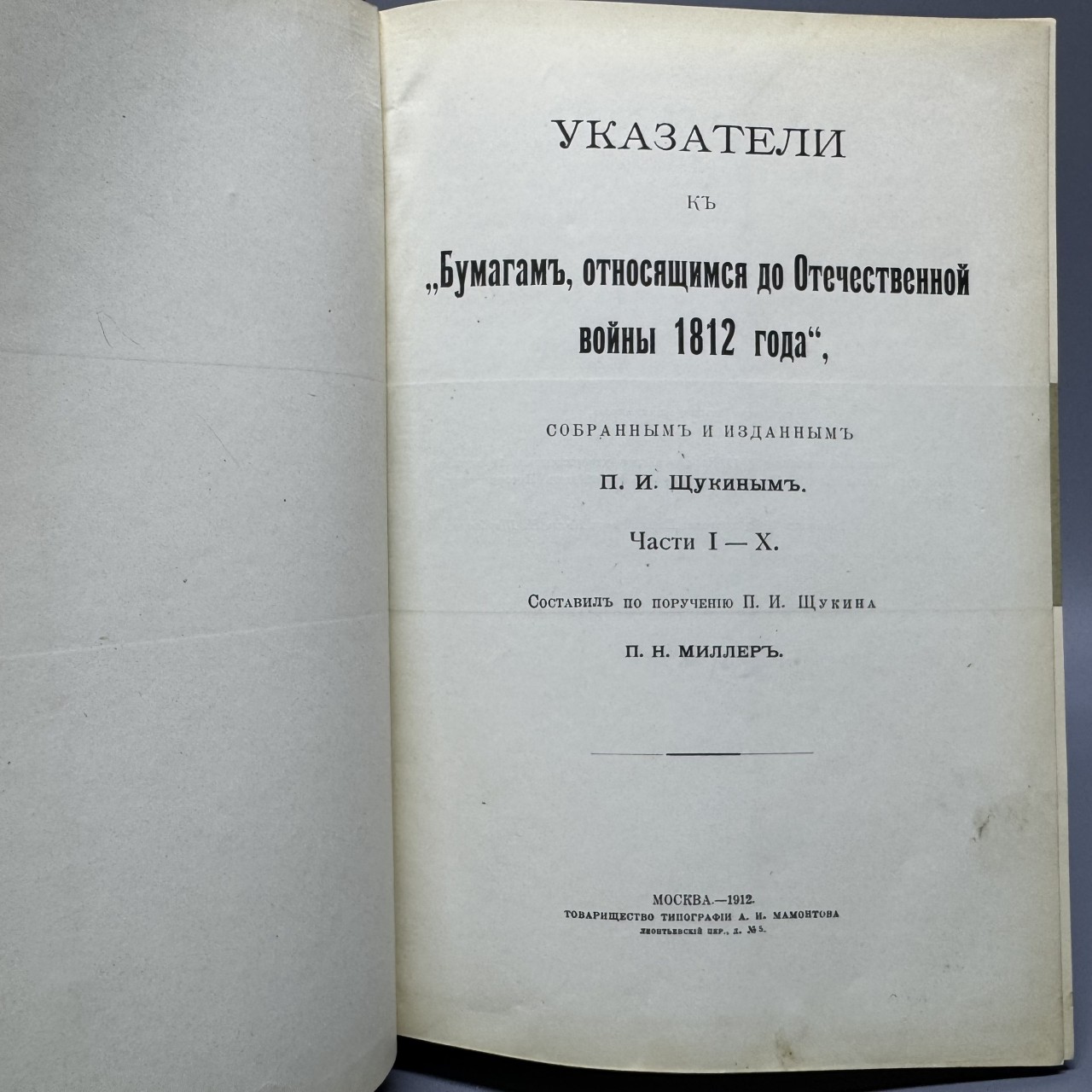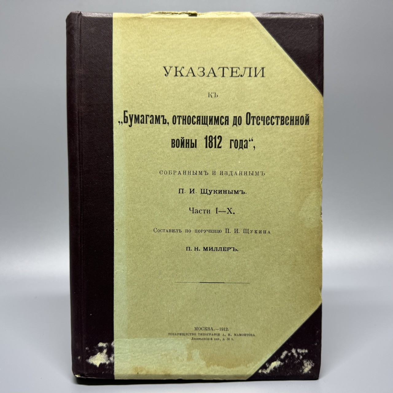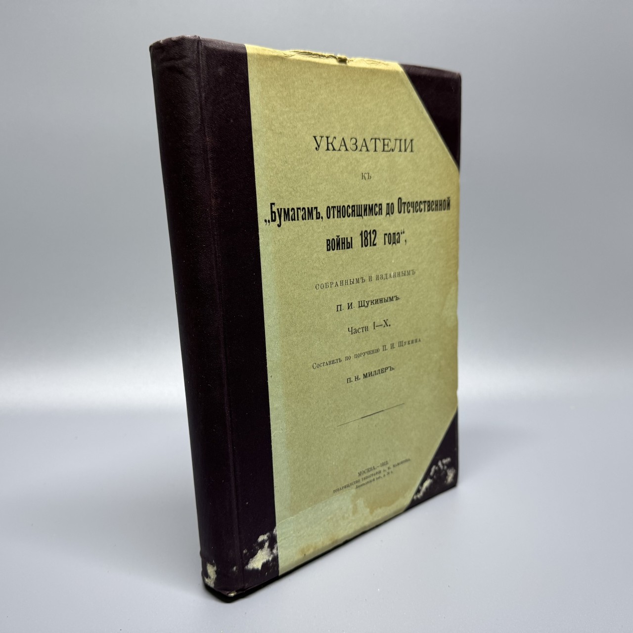 Указатели к «Бумагам, относящимся до Отечественной войны 1812 года», собранным и изданным П.И. Щукиным. Части I – X. Составил по поручению П.И. Щукина П.Н. Миллер. Москва – 1912. Товарищество типографии А. И. Мамонтова. 536 с.