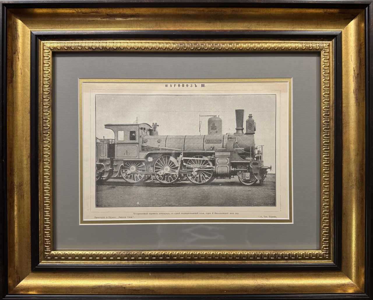Гравюра «ПАРОВОЗЪ III». Российская Империя, начало ХХ века. Брокгауз и Ефрон «Энцикл. Слов.».