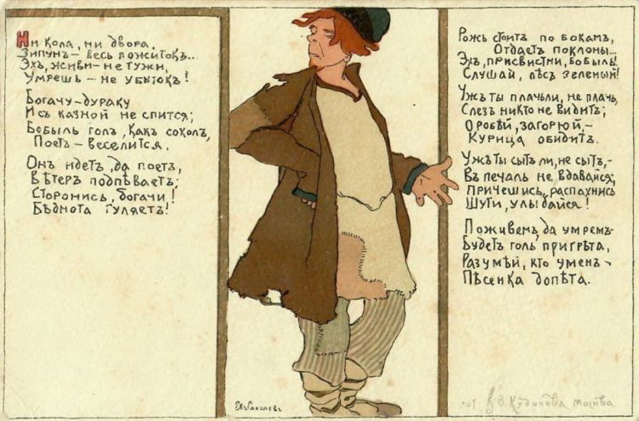 Открытка Соколов Е.Г. «Ни кола, ни двора» из серии «Деревенские сценки». Начало XX века. Изд. Кудинов. Москва.