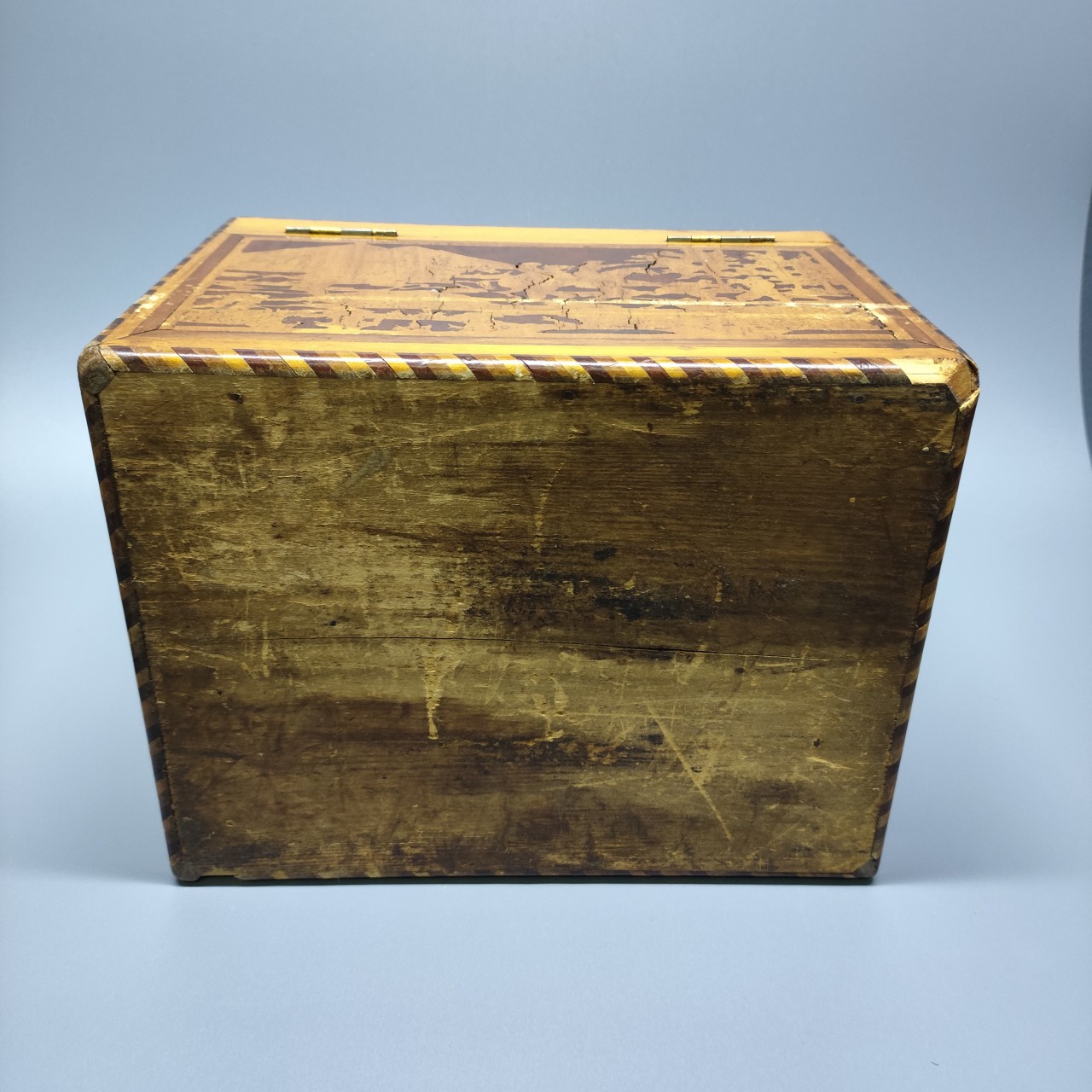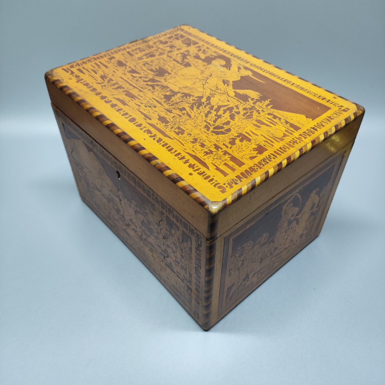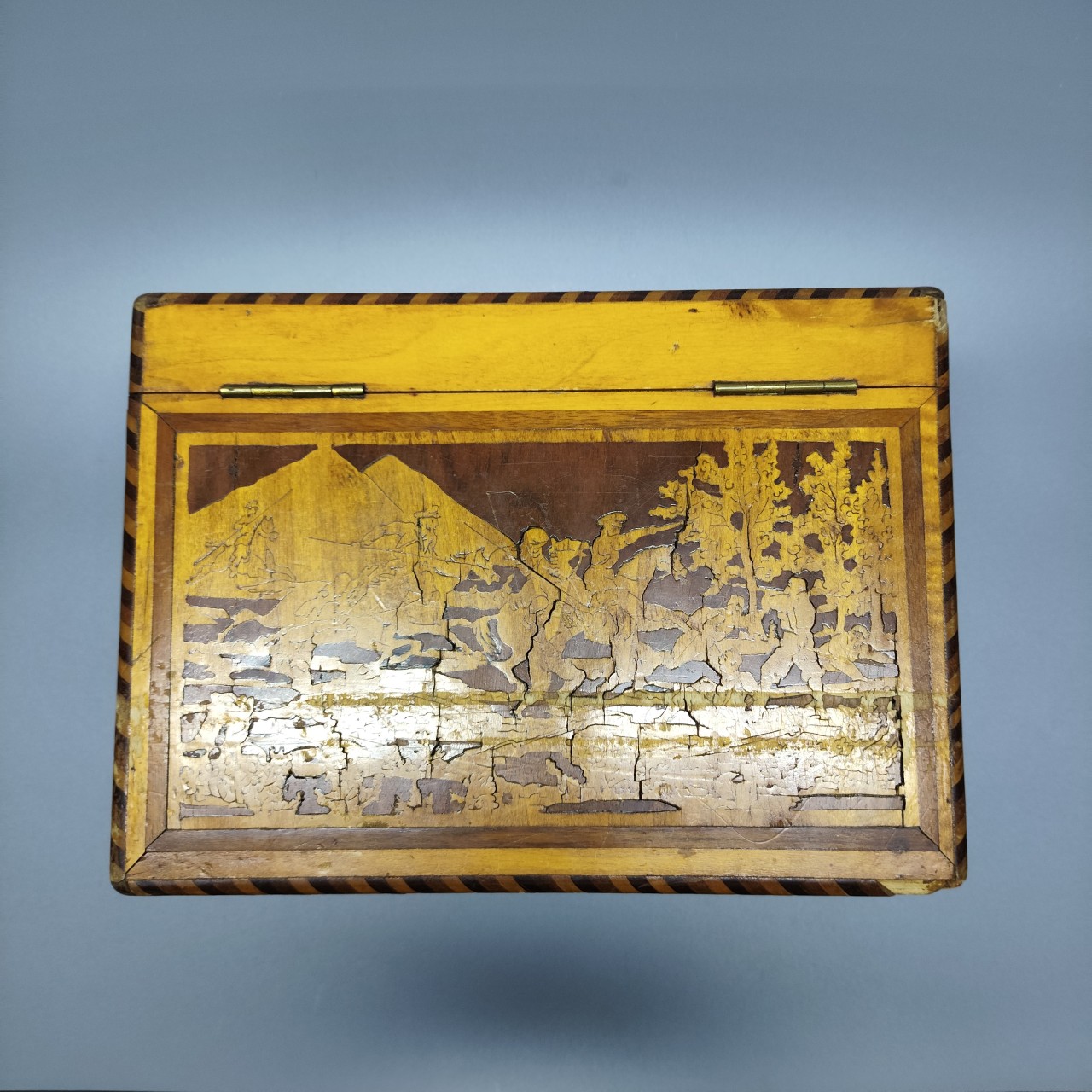 Деревянная шкатулка исполнена в технике интарсии 8 января 1877 года в Германлы. Сохранность: следы бытования, потертости, царапины. Размер: высота – 19,2 см.; 20х26 см.