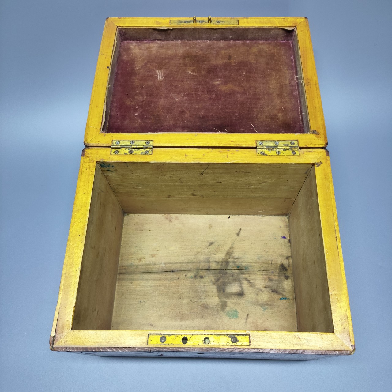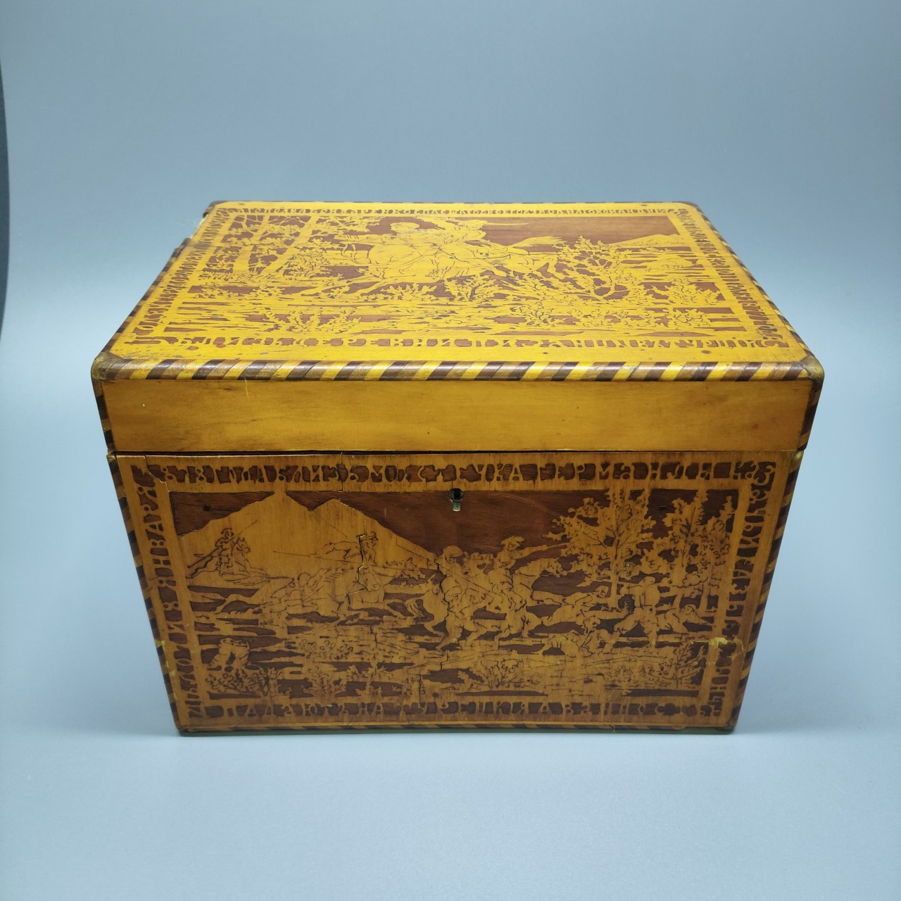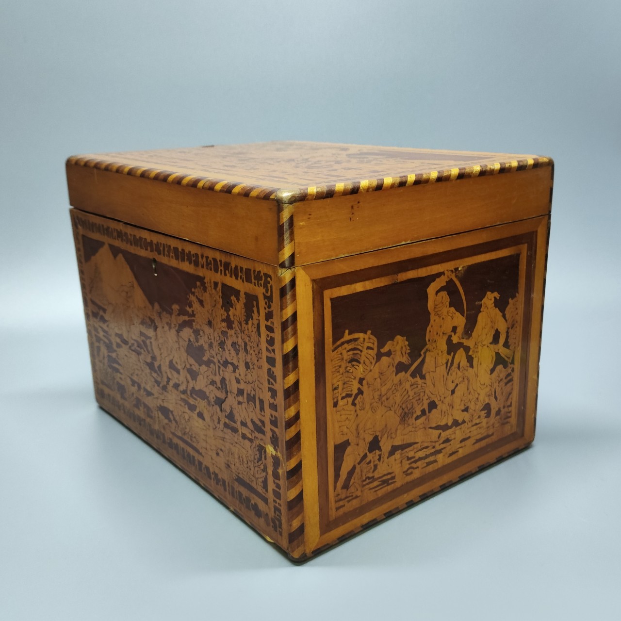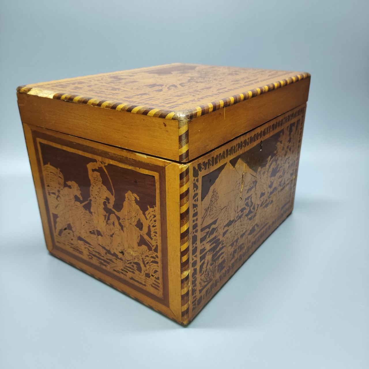 Деревянная шкатулка исполнена в технике интарсии 8 января 1877 года в Германлы. Сохранность: следы бытования, потертости, царапины. Размер: высота – 19,2 см.; 20х26 см.