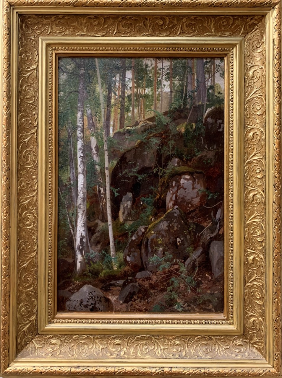 Шильдер Андрей Николаевич (1861-1919) «Лесной пейзаж с валунами». (Этюд из путешествия по Валааму). 1908 год. Картон дублированный на картон, масло. Размер: 46,3х31 см.