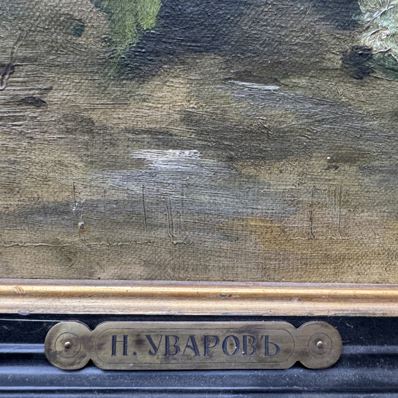 В левом нижнем углу имеется подпись, выполненная кистью коричневым пигментом по полупросохшему красочному слою: «Н. Уваровъ.».