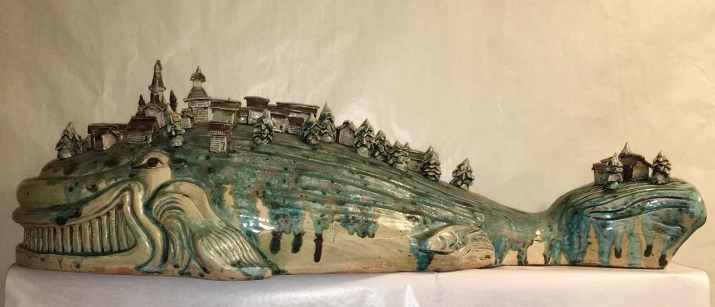 Композиция «Рыба-Кит» представляет собой вытянутое по горизонтали скульптурное изображение кита. Глаза, плавники, раскрытая пасть и хвост проработаны рельефом. На голове, спине и хвосте рыбы расположены архитектурные постройки в окружении деревьев – церковь, колокольня, дома, сараи. Скульптура покрыта цветной глазурью зеленовато-голубого цвета. Отдельные детали расписаны темно-коричневой краской. Композиция «Рыба-Кит» крупная, сложная в изготовлении. Внутренняя поверхность тулова рыбы с достаточно тонкими стенками укреплена каркасом вручную вылепленных «кессонов», что позволило без потерь и дефектов обжечь столь сложную конструкцию.
