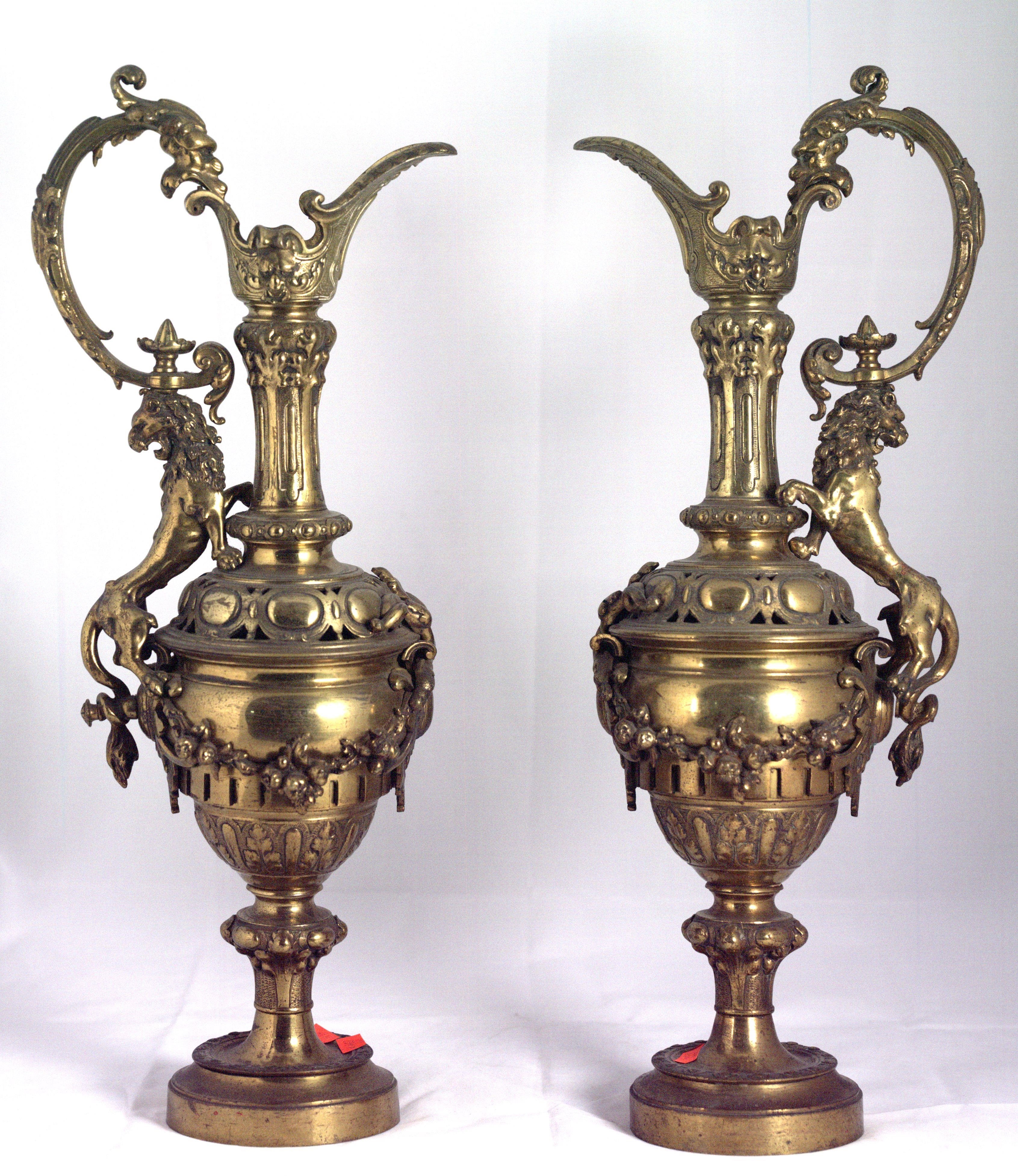 Вазы парные в форме кувшинов-курильниц со львами. Франция, середина XIX века. Бронза, литье, чеканка, гравировка.