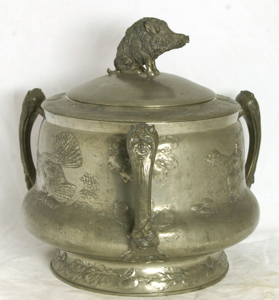 крышка украшена наверху объемной скульптурой, изображающей дикого вепря. Вверху