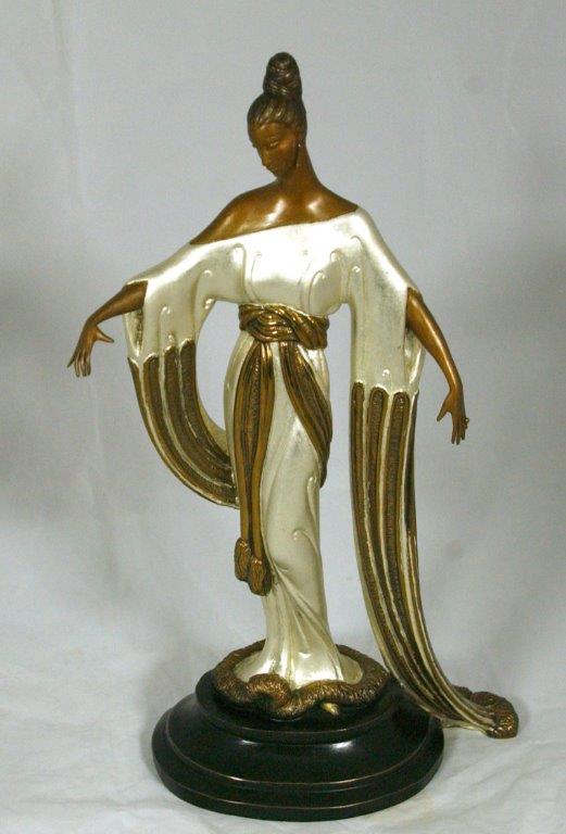 Камерная скульптура из патинированной эмалированной позолоченной бронзы на округлом постаменте из черного камня изображает молодую женщину, стоящую во фронтальной позе. Она одета в длинное складчатое светло-золотистое одеяние с летящими широкими рукавами, украшенное золочением. Кисти рук с удлиненными пальцами и изящная головка покрыты золотисто-бронзовым патинированием. На голове женщины прическа в виде высокого пучка. В ушах – серьги, на пальце – кольцо. Легкие одежды схвачены длинным золотым поясом с кистями. На основании факсимильная гравированная подпись скульптора и надпись – «1984», «A.P. 23/50», «Fine Art Acquisitions», подпись, характерная для работ скульптора Эрте и гарантирующая ее подлинность. Это известная американская фирма, занимающаяся всем спектром жанров современного искусства, в том числе торговлей художественными бронзовыми отливками, в данном случае - отливка №23 из лимитированной серии в 50 экземпляров. Фирма имела теснейшие связи со знаменитым скульптором Эрте. Данная подпись характерна для работ скульптора Эрте, гарантирует ее подлинность, и указывает также номер отливки из лимитированной серии и дату. Авторское название скульптуры — «Неглиже».