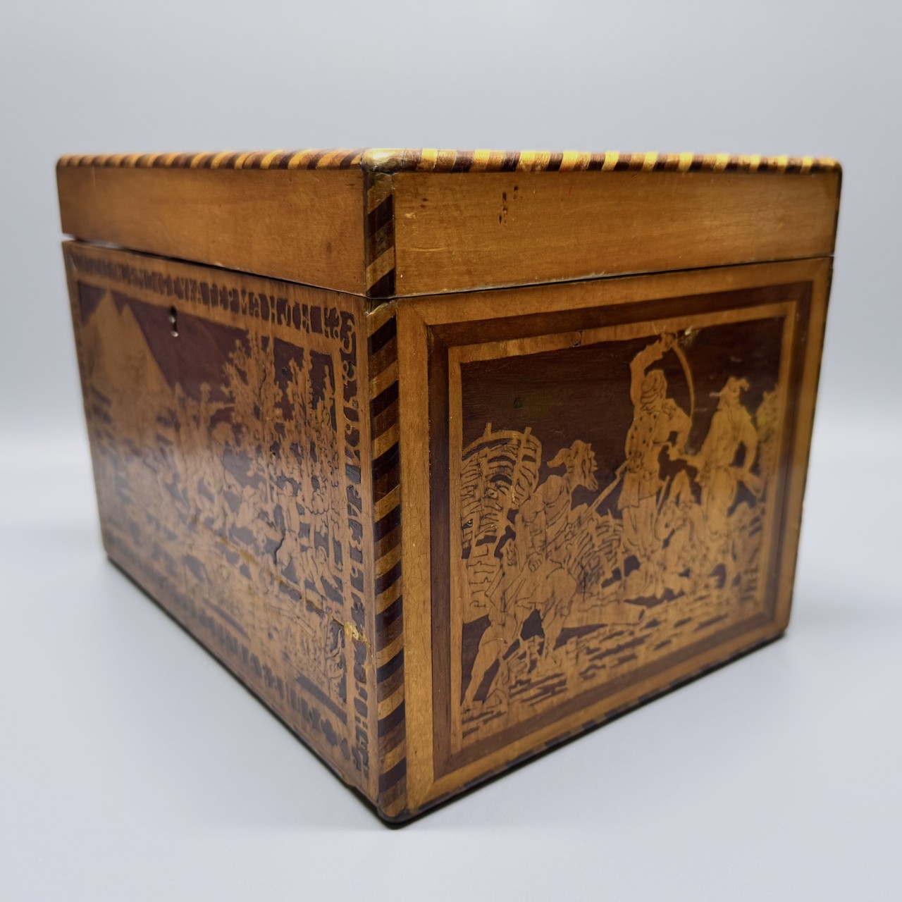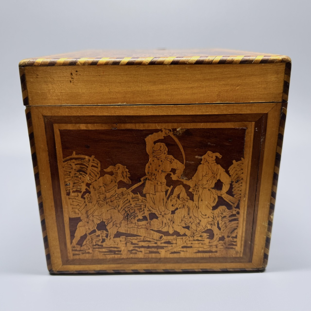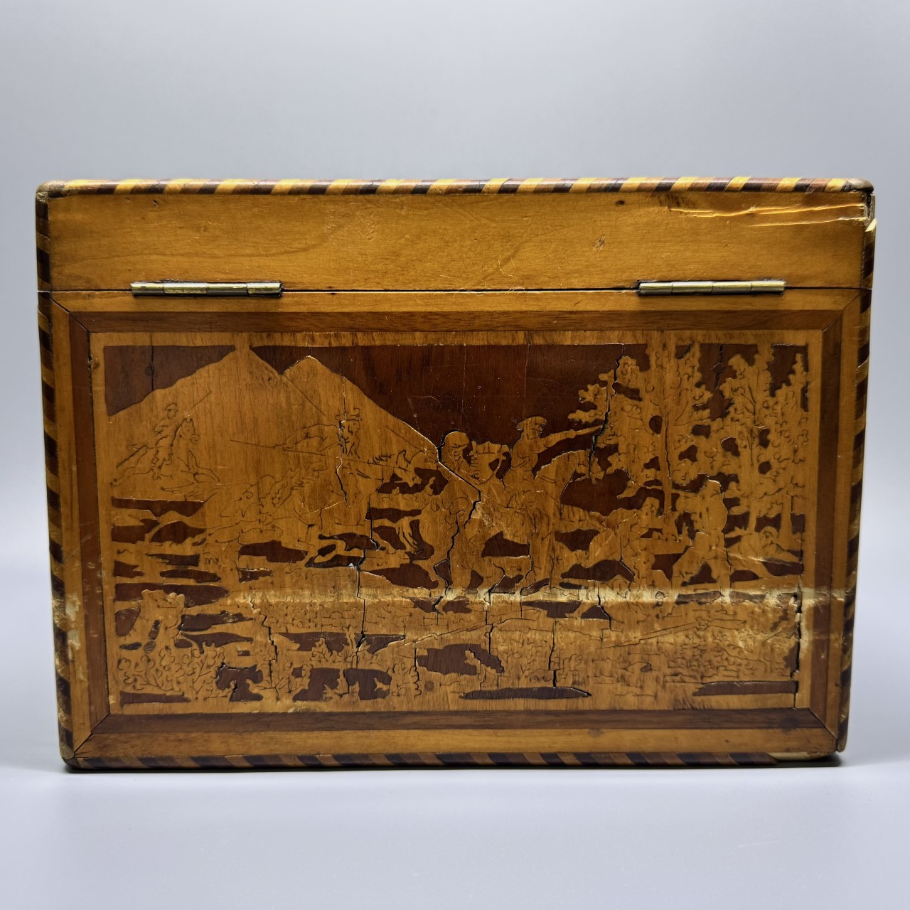 Деревянная шкатулка исполнена в технике интарсии 8 января 1877 года в Германлы. Сохранность: следы бытования, потертости, царапины. Размер: высота – 19,2 см.; 20х26 см.