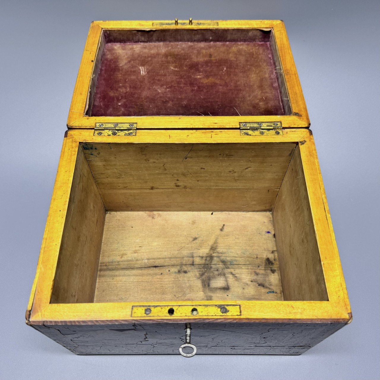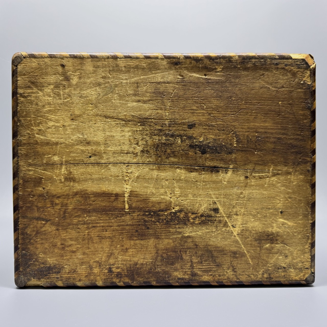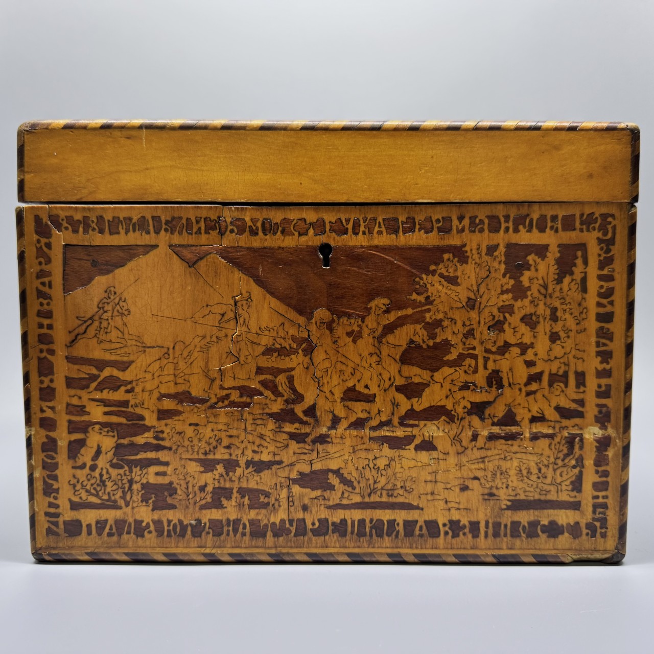 Деревянная шкатулка исполнена в технике интарсии 8 января 1877 года в Германлы. Сохранность: следы бытования, потертости, царапины. Размер: высота – 19,2 см.; 20х26 см.
