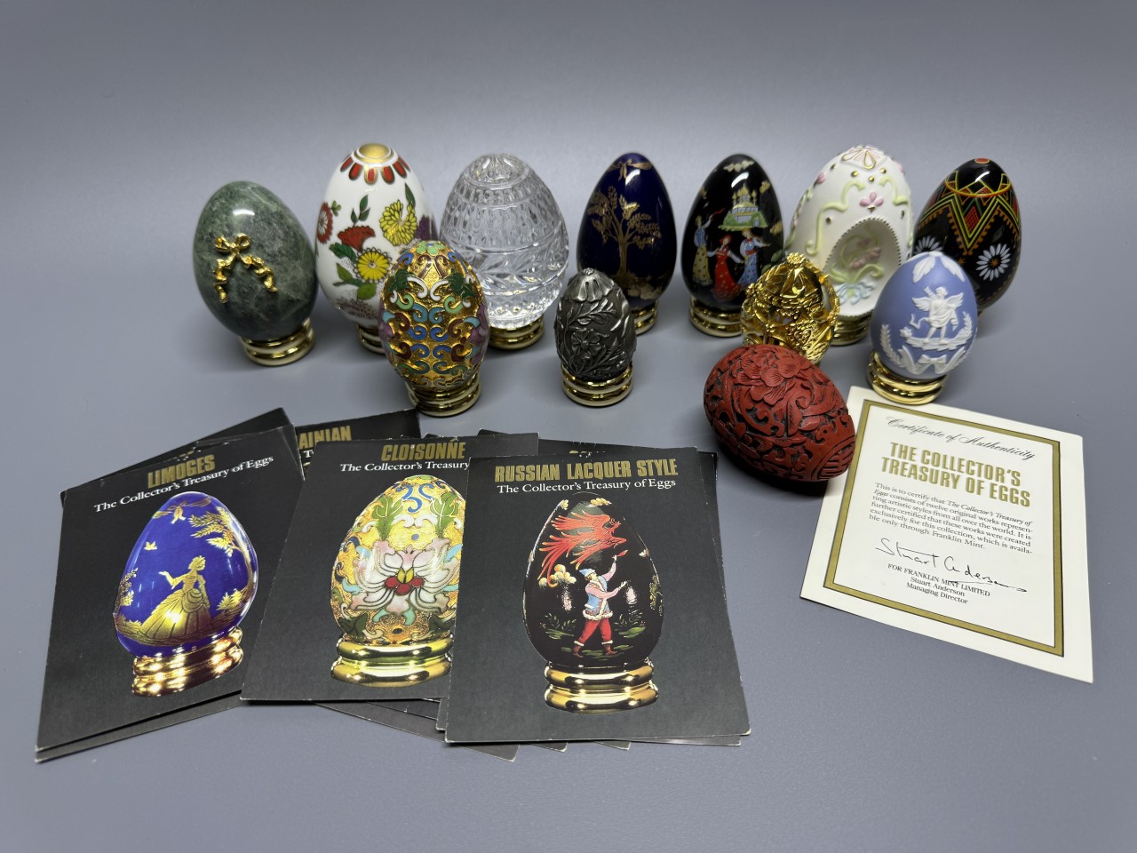 Набор включает 12 различных яиц, выполненных в разных стилях ( Лиможский фарфор, Клуазоне (перегородчатая эмаль), русский лаковый стиль и др.). Фарфор, бисквит, стекло, металл и др.