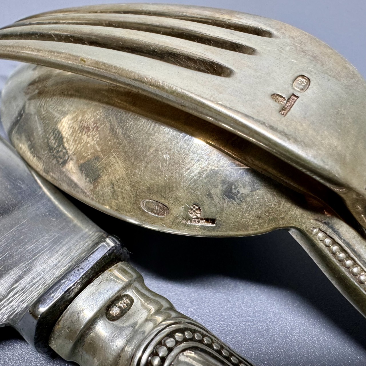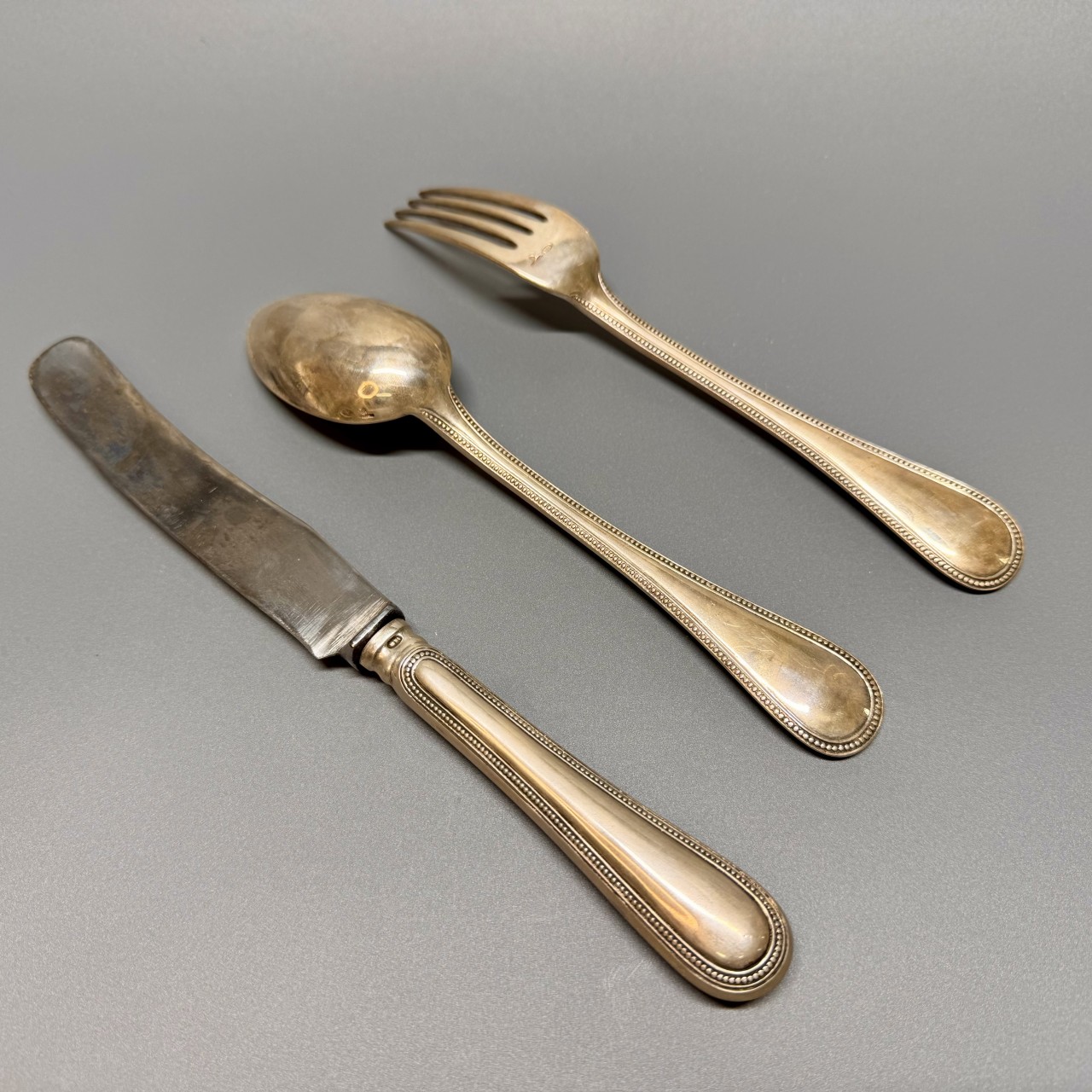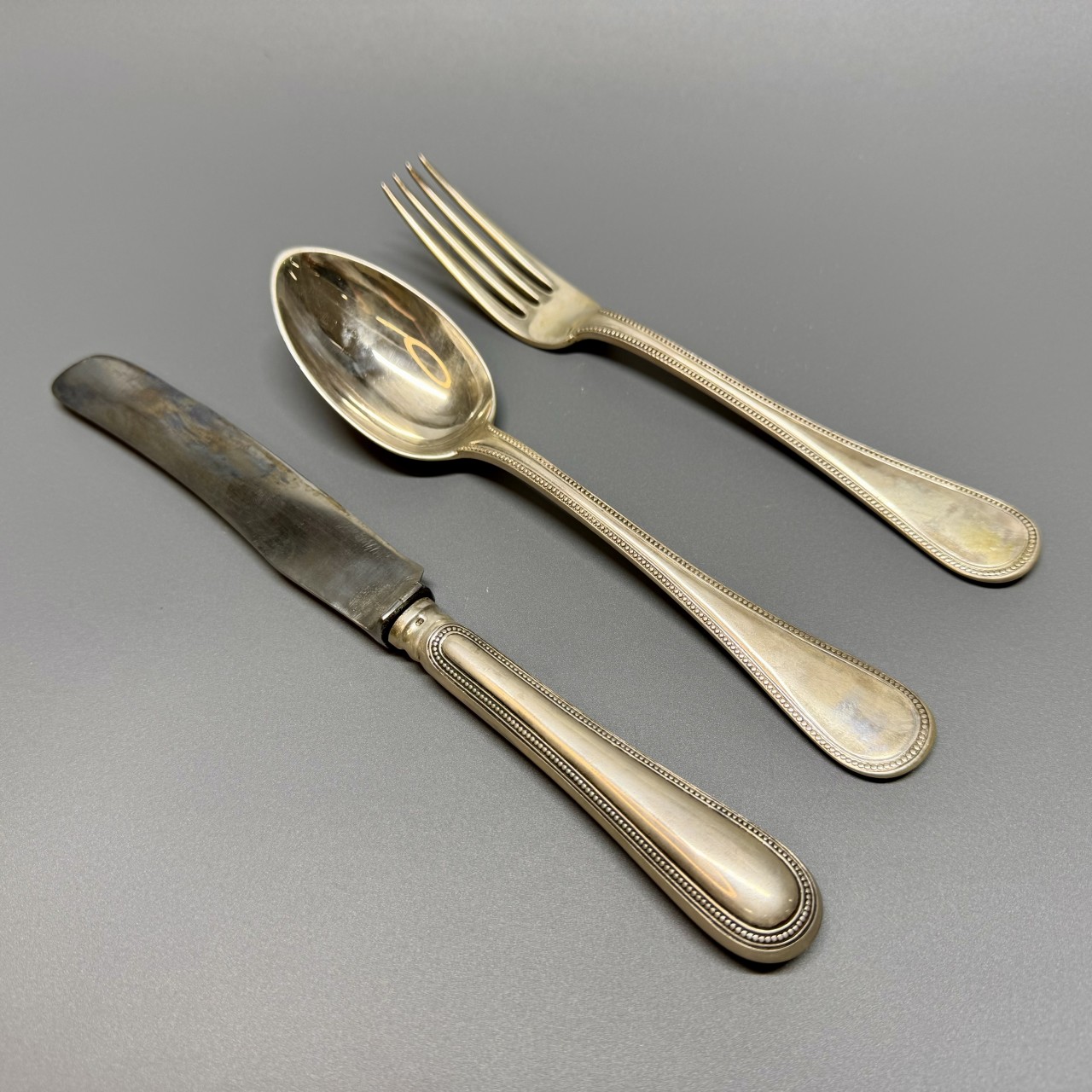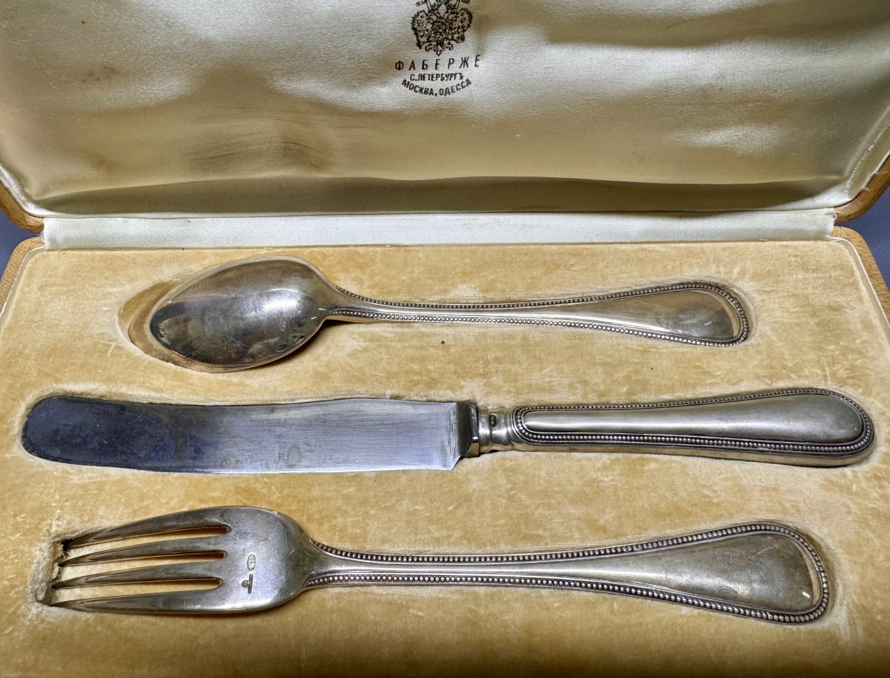 Столовый набор «Эгоист» (ложка, вилка, нож). Российская Империя, XIX век. Фирма Карла Фаберже. Серебро 84 пробы. В подарочной упаковке.