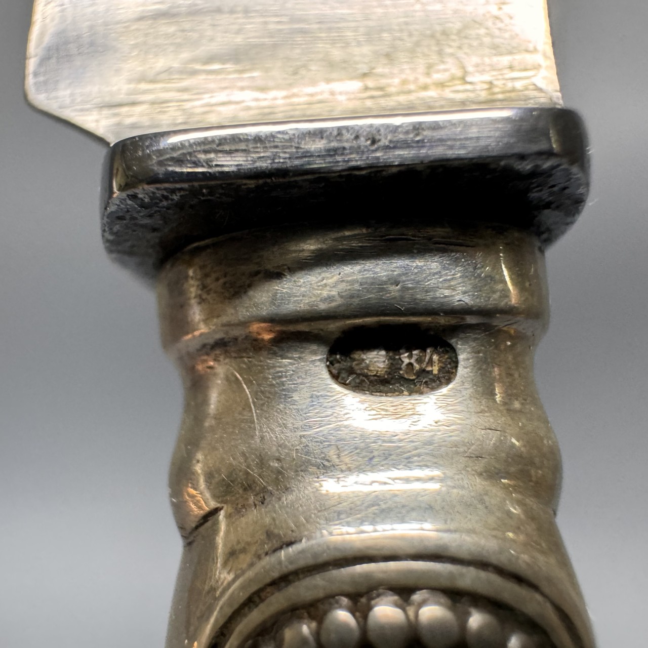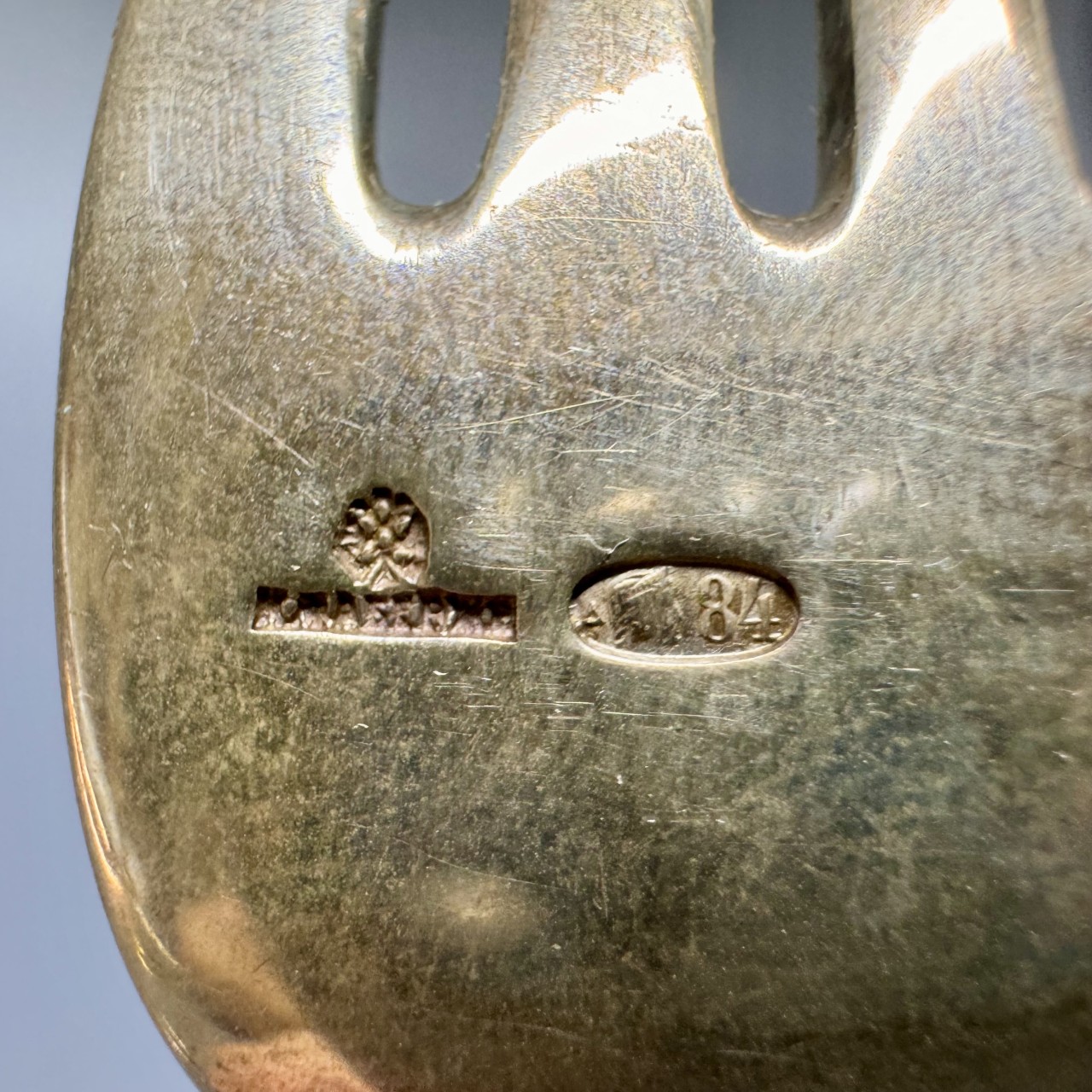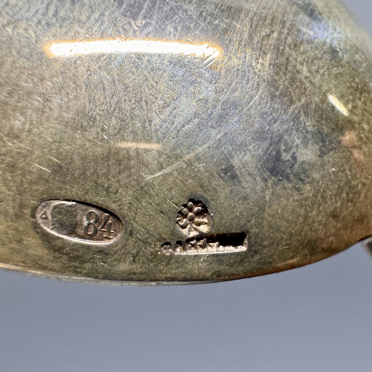 Клеймо: «Дельта» - клеймо Московского пробирного управления; женская голова в кокошнике, обращенная вправо, цифра «84», обозначающая пробу.