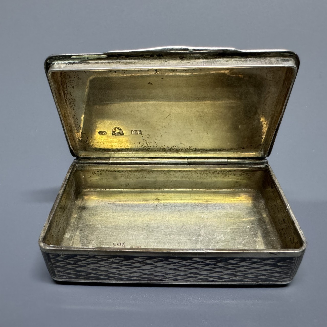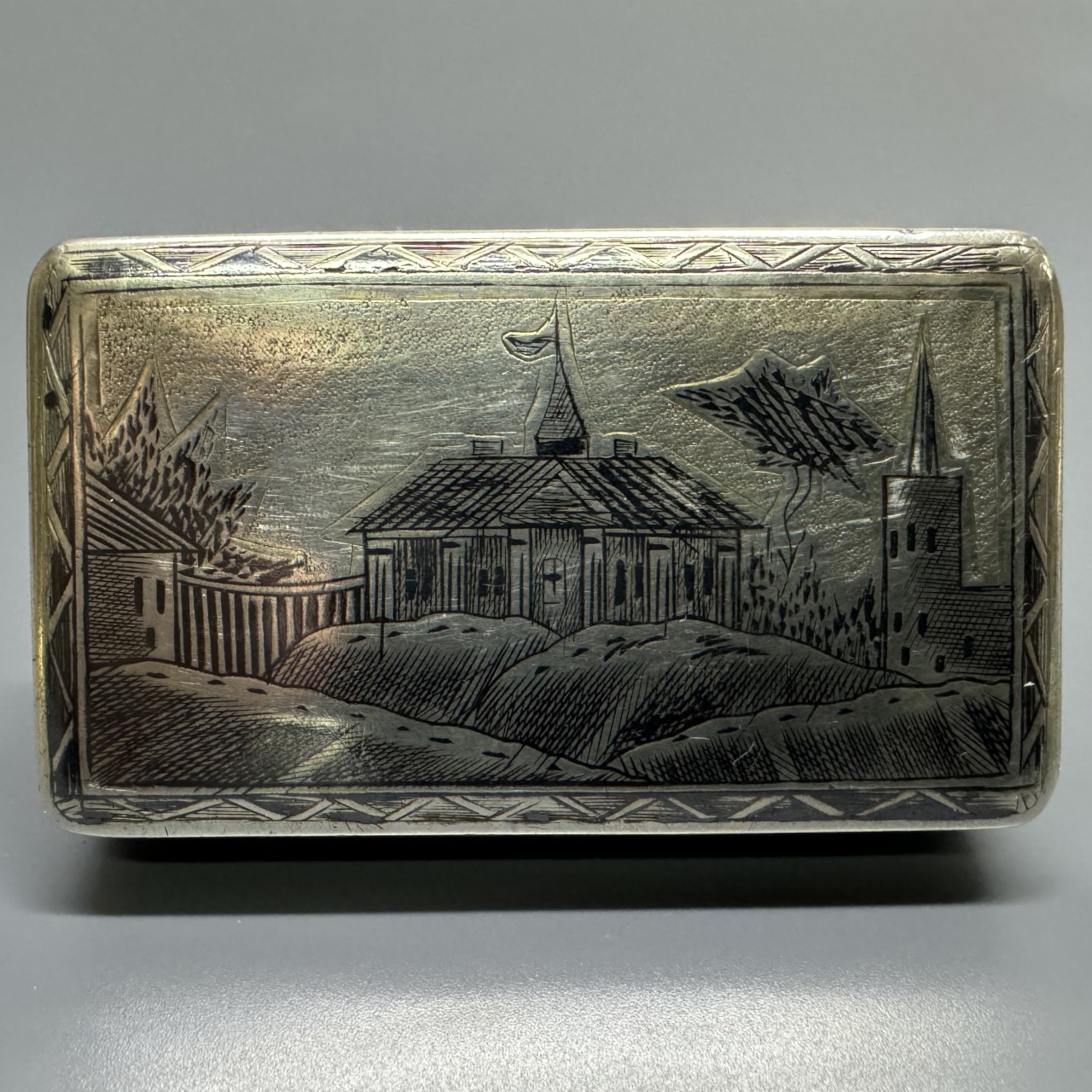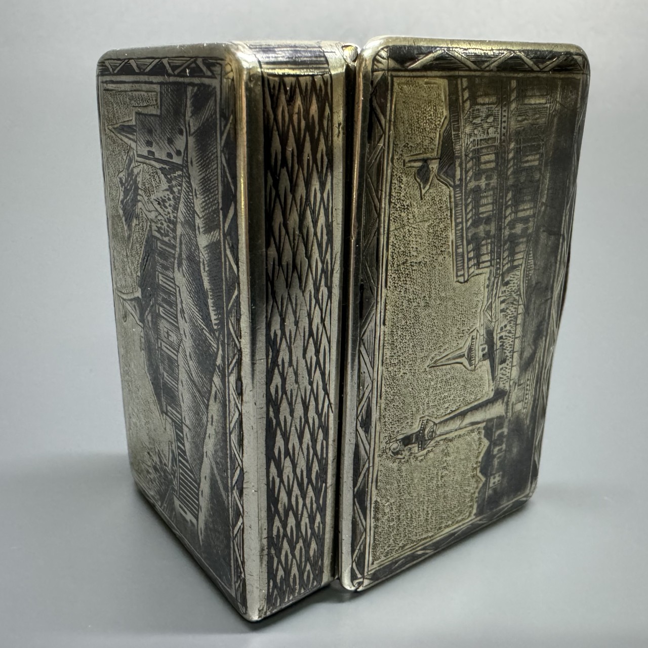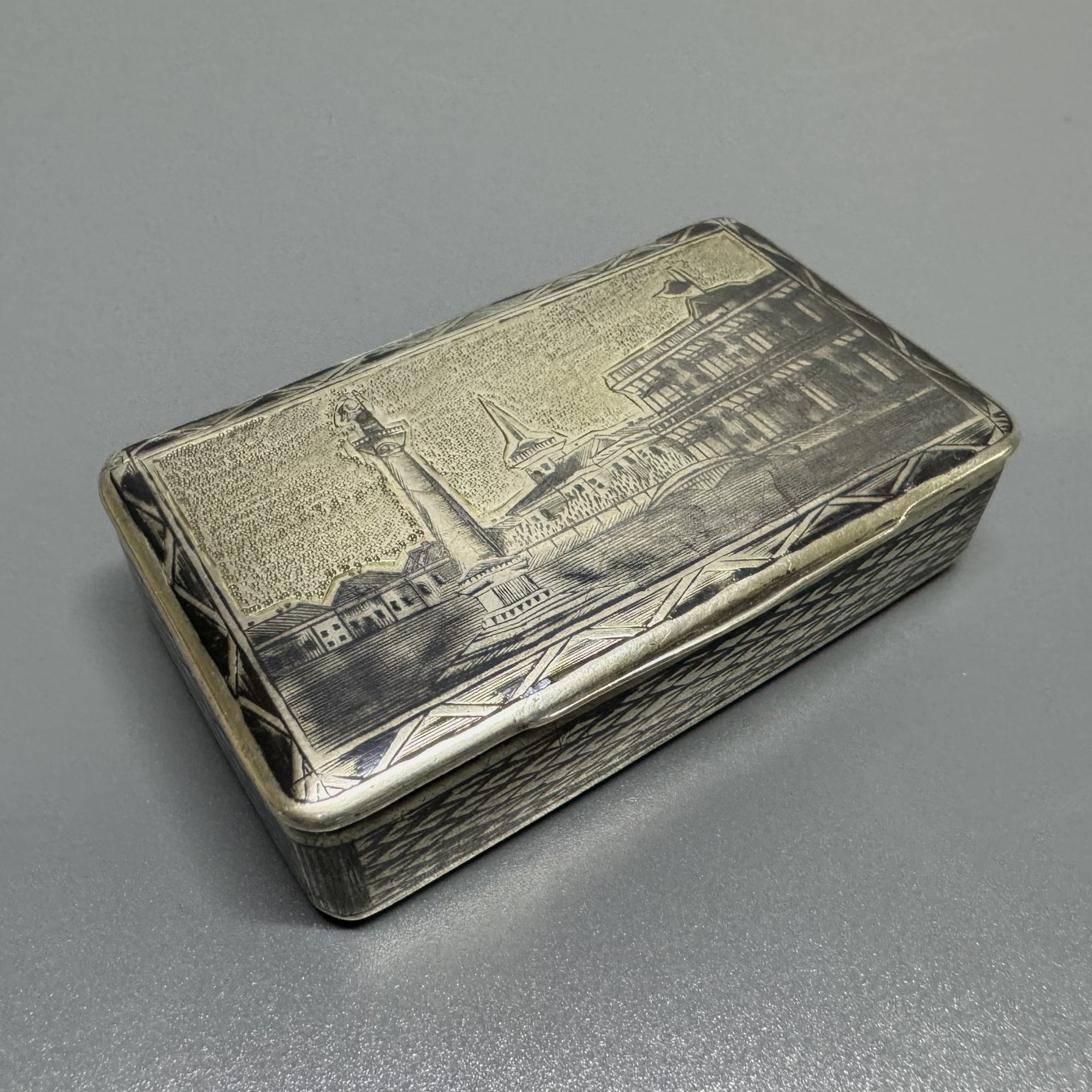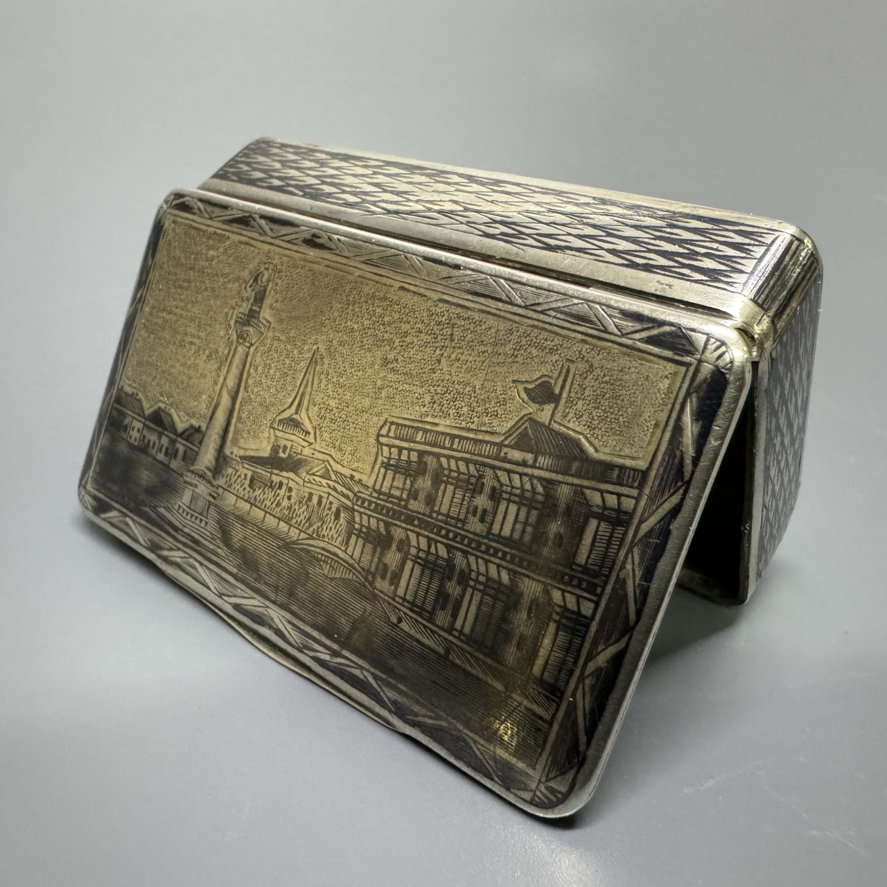 Табакерка «Сенатская площадь». Российская Империя, Москва, 1843 год. Серебро 84 пробы, чернение, гравировка.