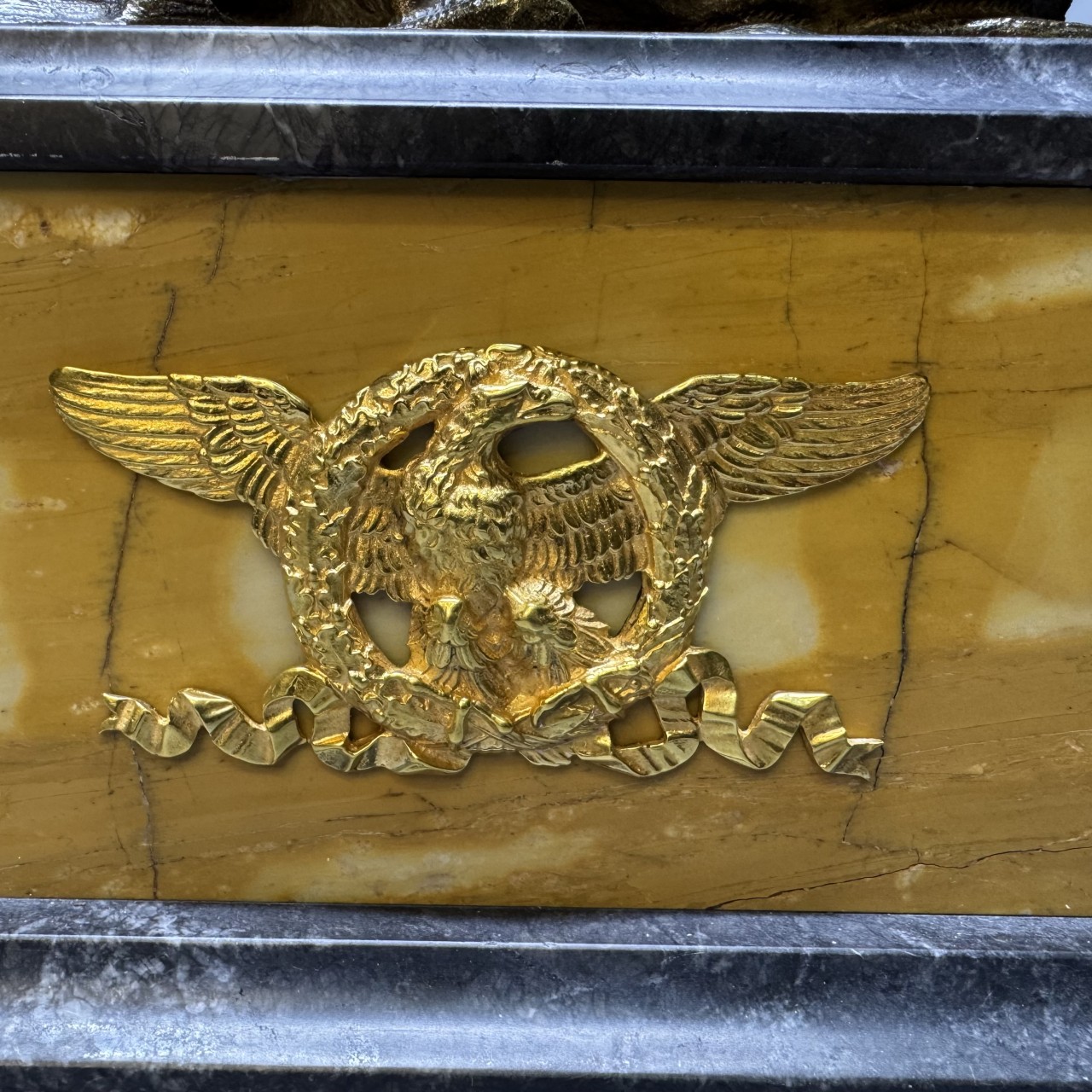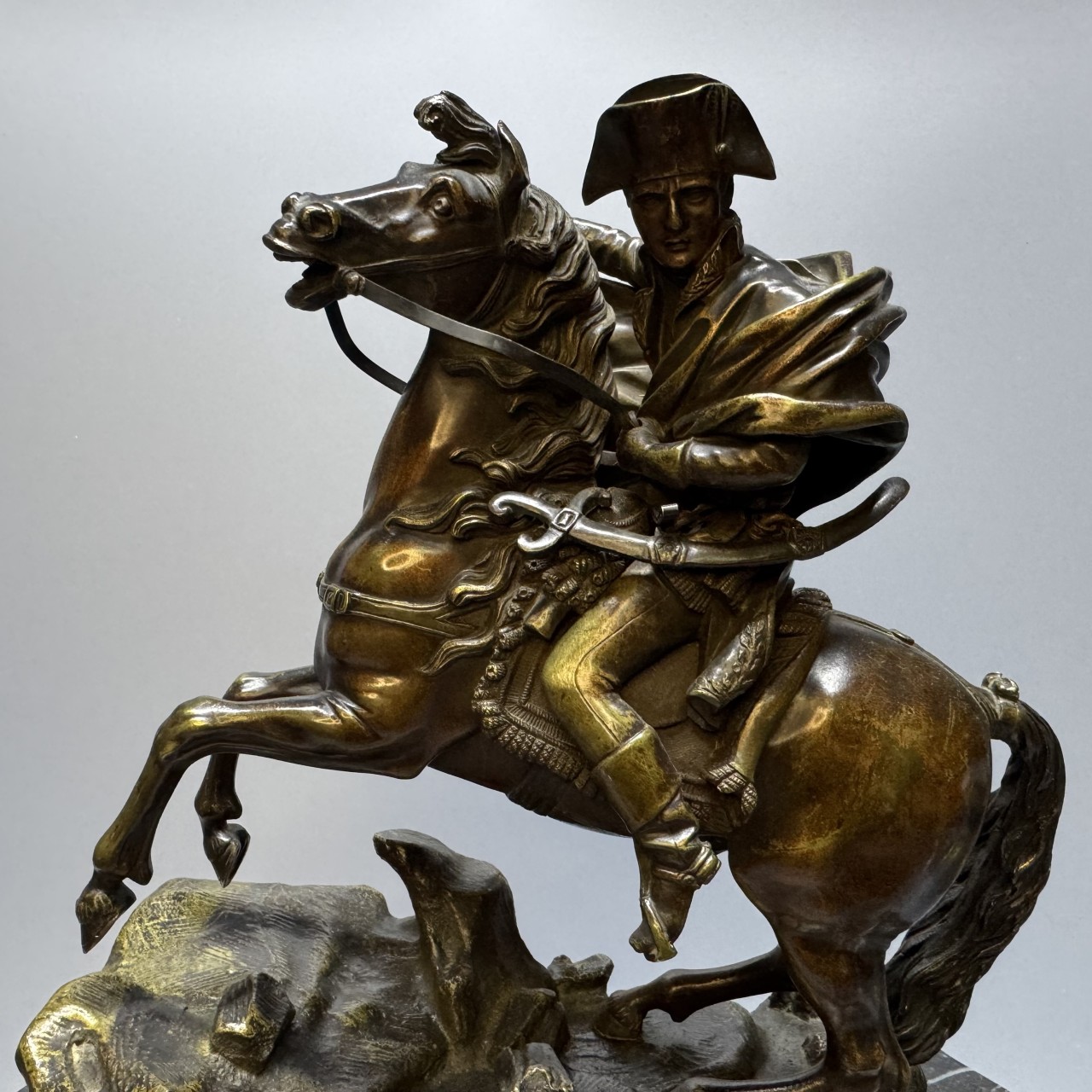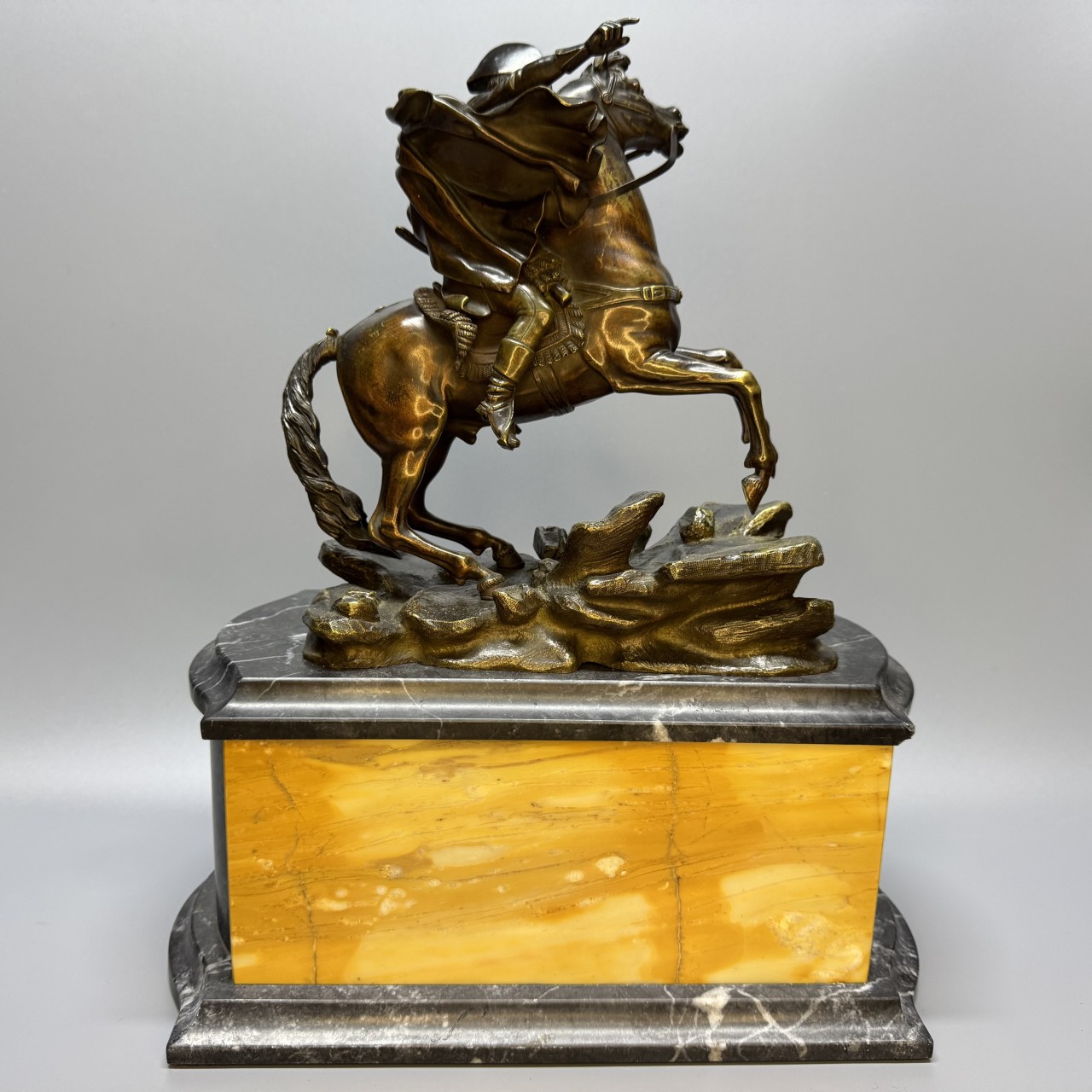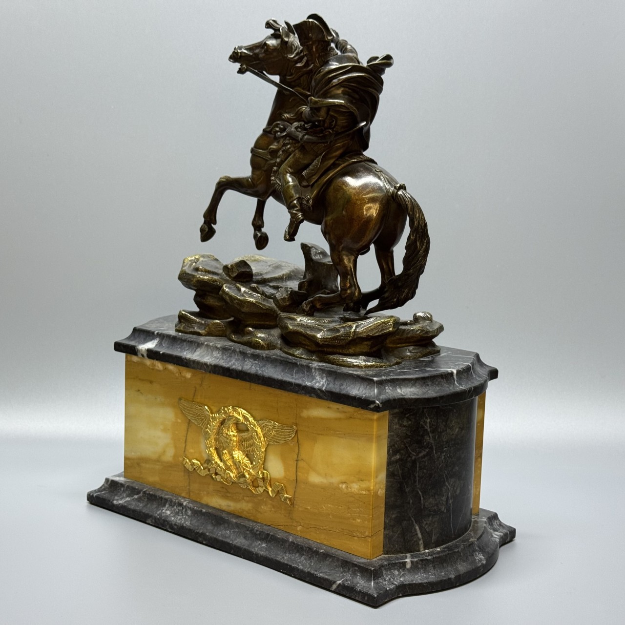 Скульптурная композиция «Наполеон на коне». Франция, конец XIX - начало ХХ вв. Бронза, литье, патинирование. Постамент: камень, бронзовая накладка в виде орла с расправленными крыльями, стоящего на основании лаврового венка (золочение). Модель с известной картины «Бонапарт на перевале Сен-Бернар» Жака Луи Давида, 1801 года.
